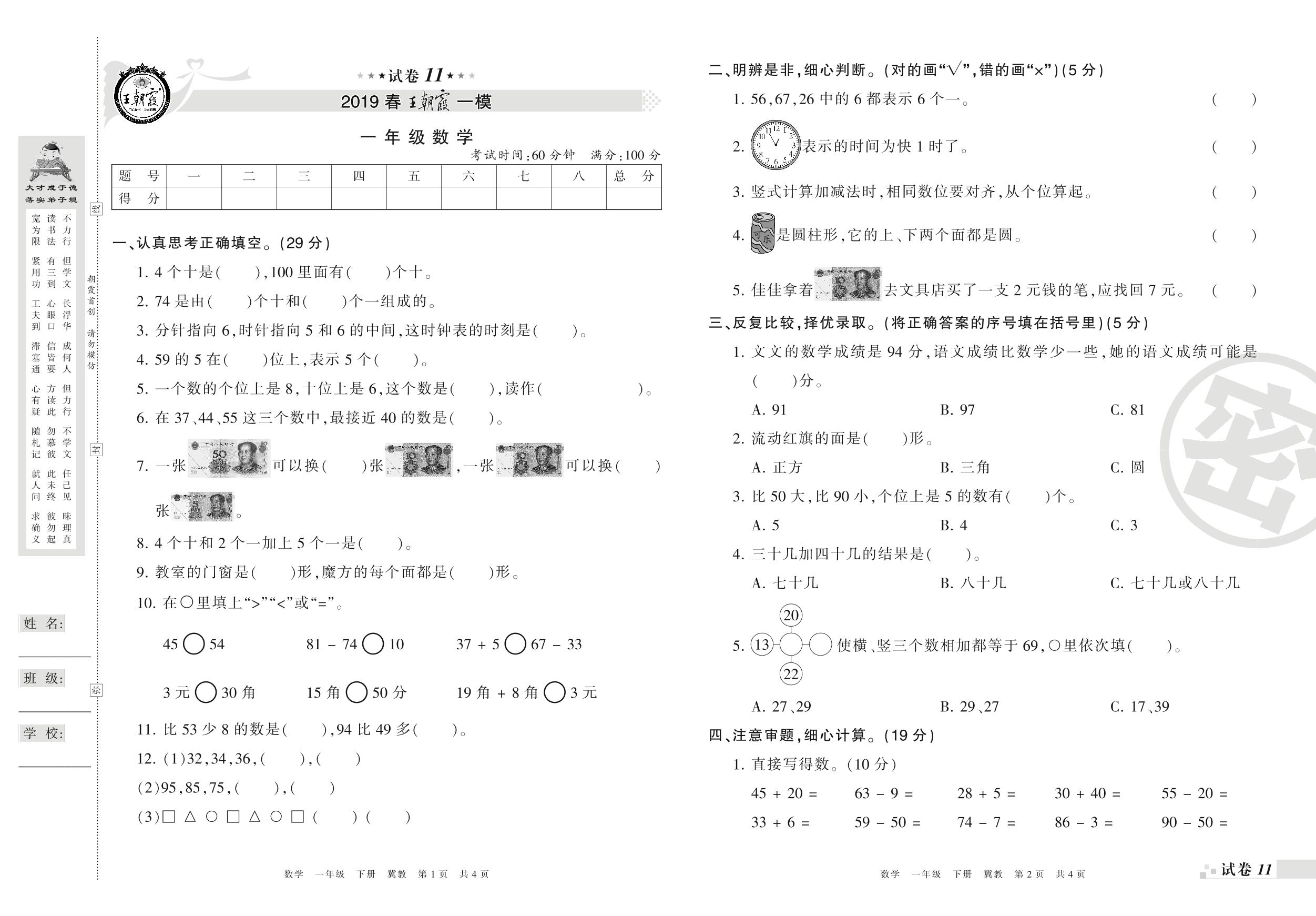 王朝霞期末模拟卷一年级下册数学(冀教版)_R210802220347【11】