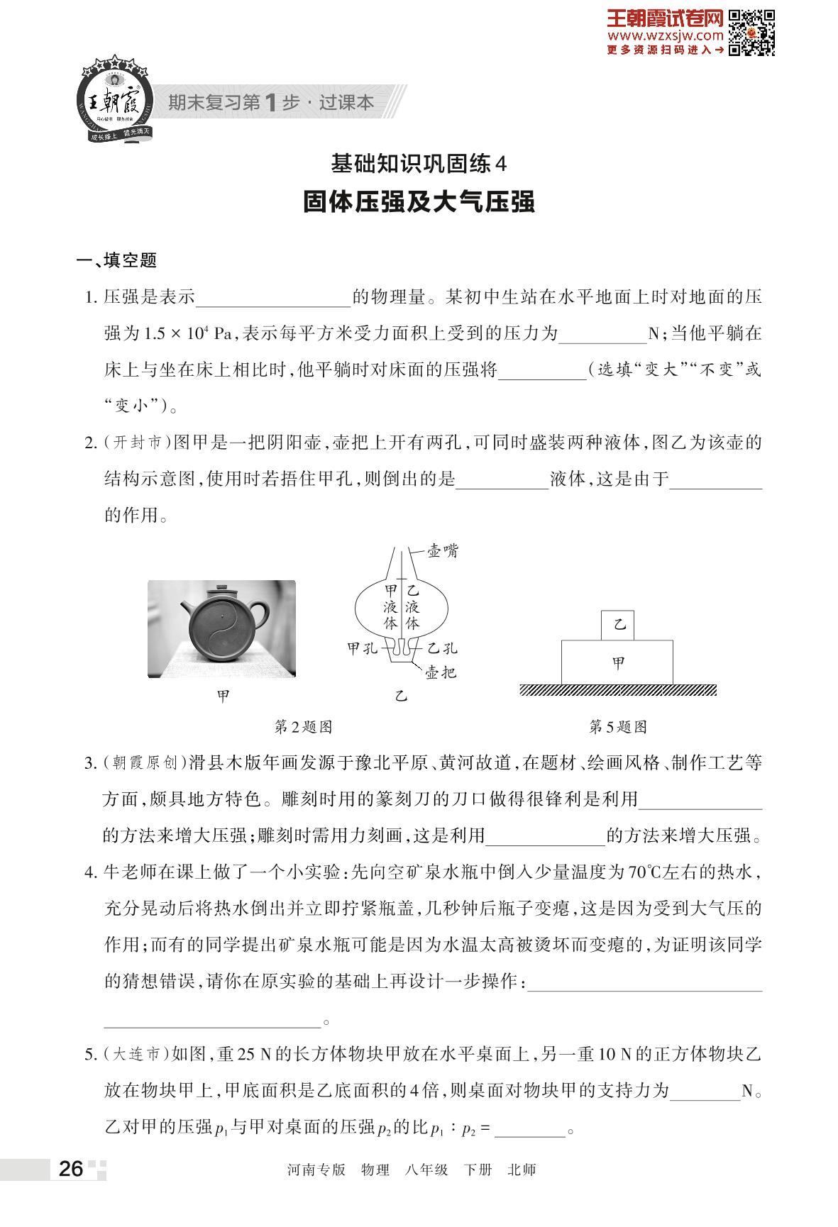 王朝霞期末过课本——基础知识巩固练4 固体压强及大气压强八年级下册物理(北师版)_R230424174314972
