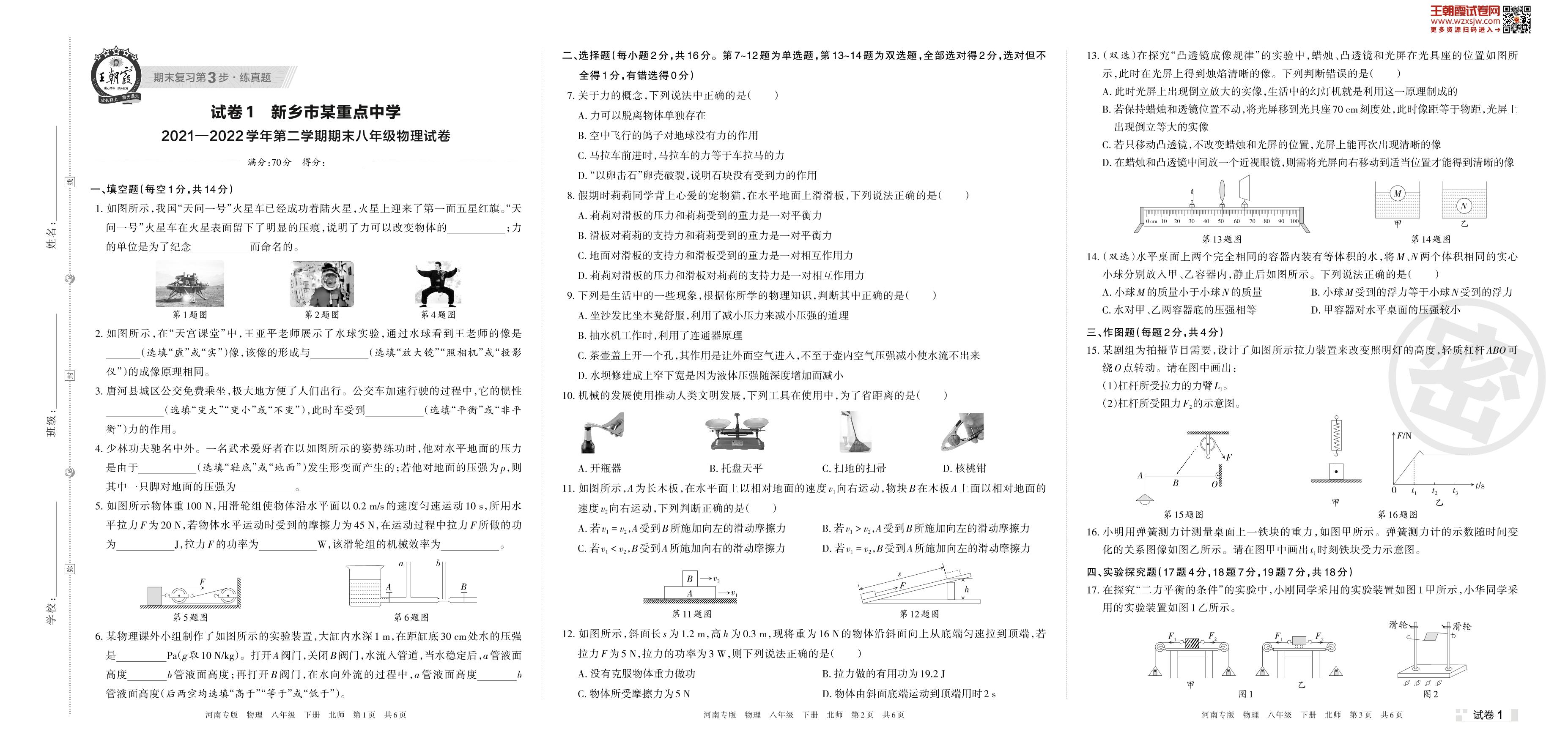 新乡市某重点中学2021—2022学年第二学期期末八年级物理试卷(北师版)【1】