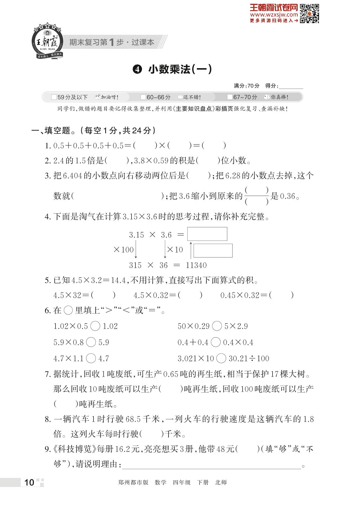 王朝霞期末过课本——4 小数乘法(一)四年级下册数学(北师版)