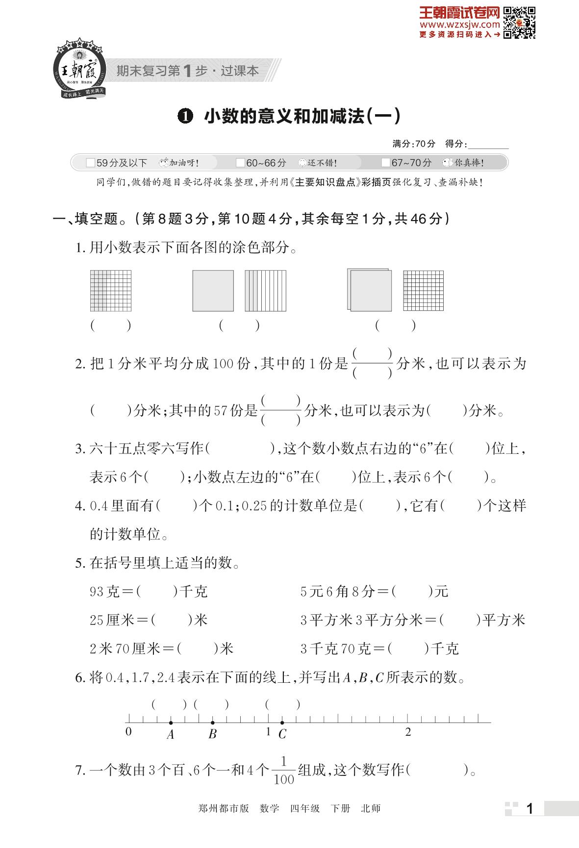 王朝霞期末过课本——1 小数的意义和加减法(一)四年级下册数学(北师版)