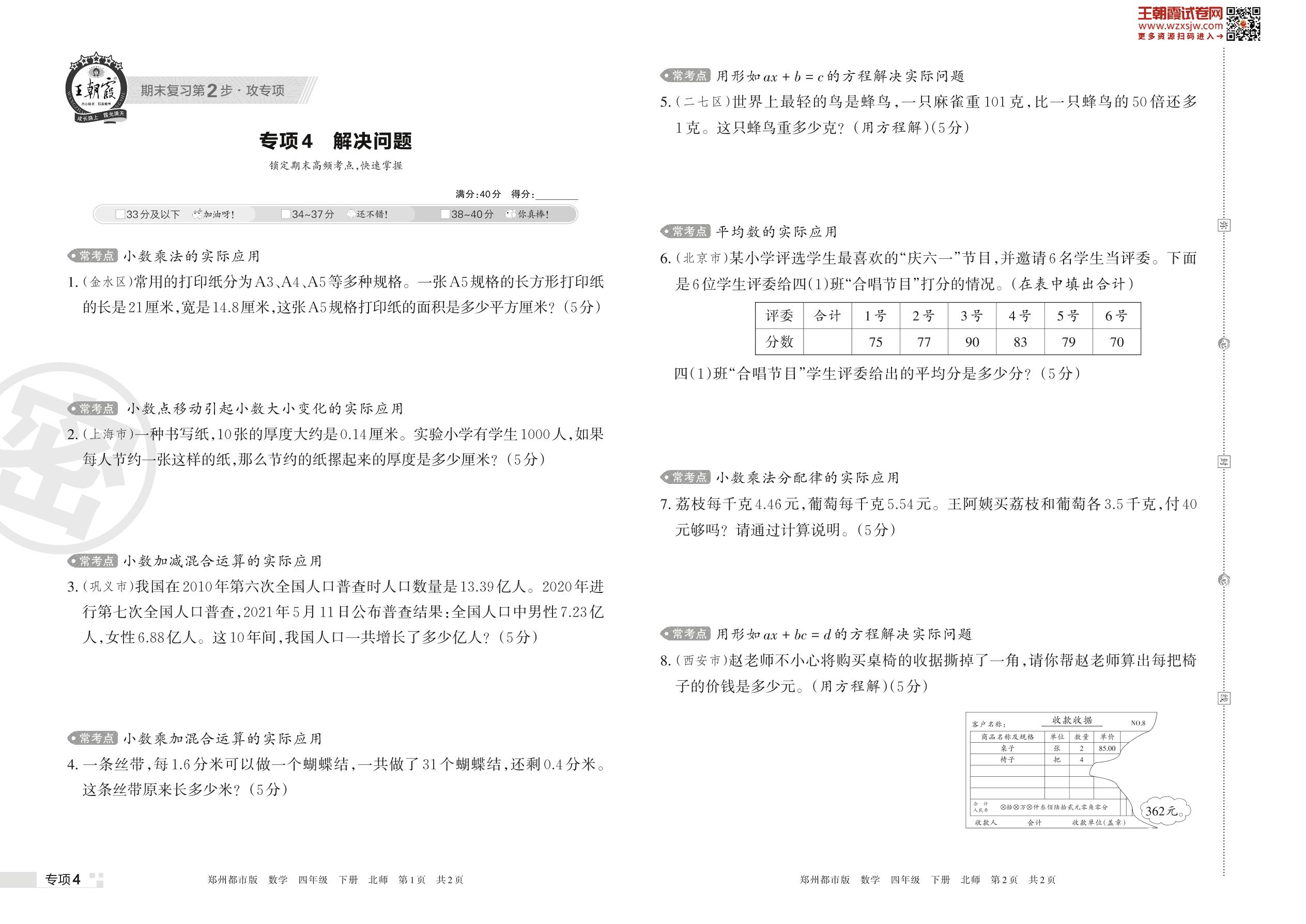 王朝霞期末专项卷——解决问题四年级下册数学(北师版)_R230424174531884【4】