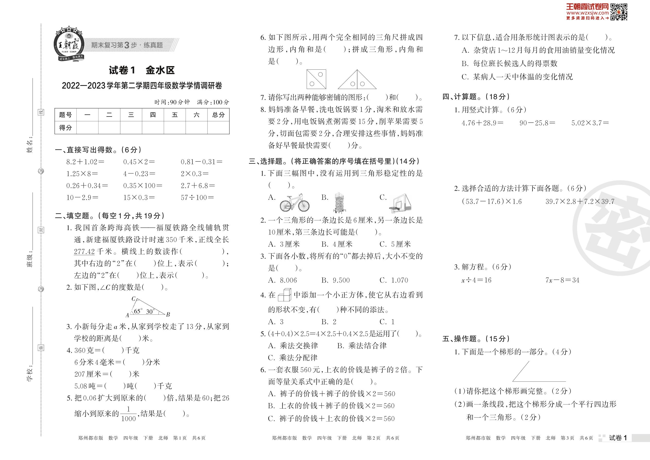金水区2022—2023学年第二学期四年级数学学情调研卷(北师版)【1】