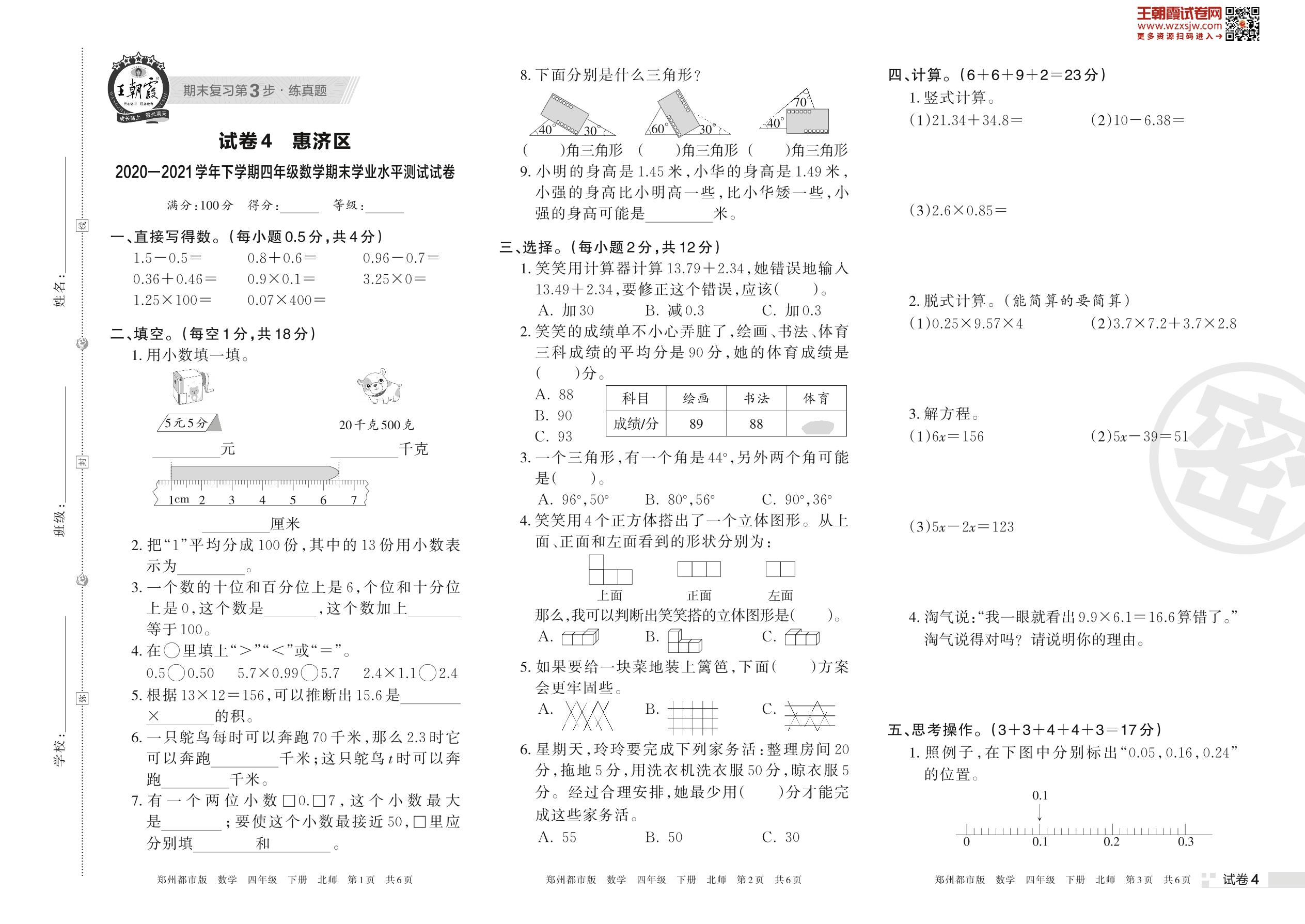 惠济区2020—2021学年下学期四年级数学期末学业水平测试试卷(北师版)【4】