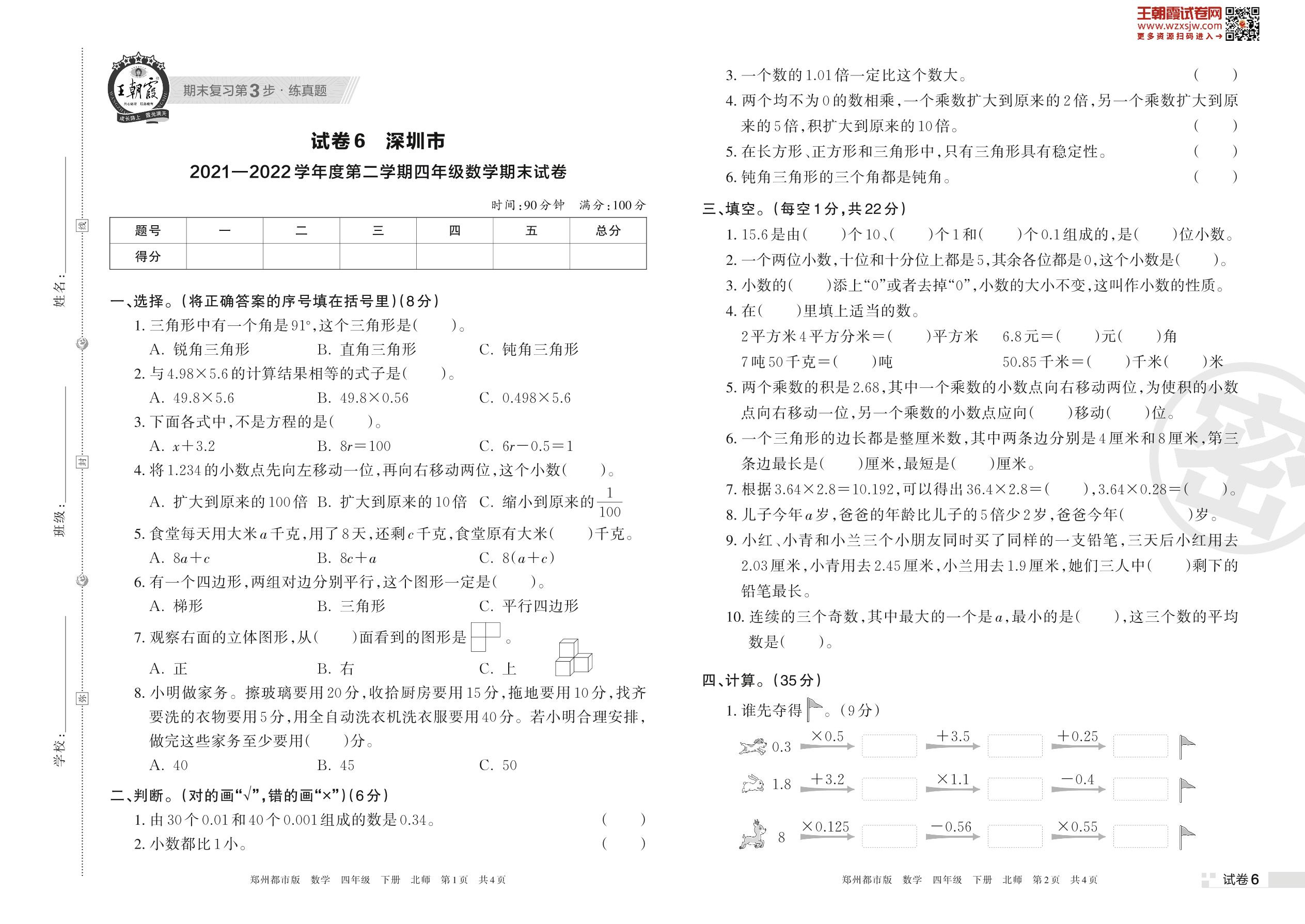 深圳市2021—2022学年度第二学期四年级数学期末试卷(北师版)【6】