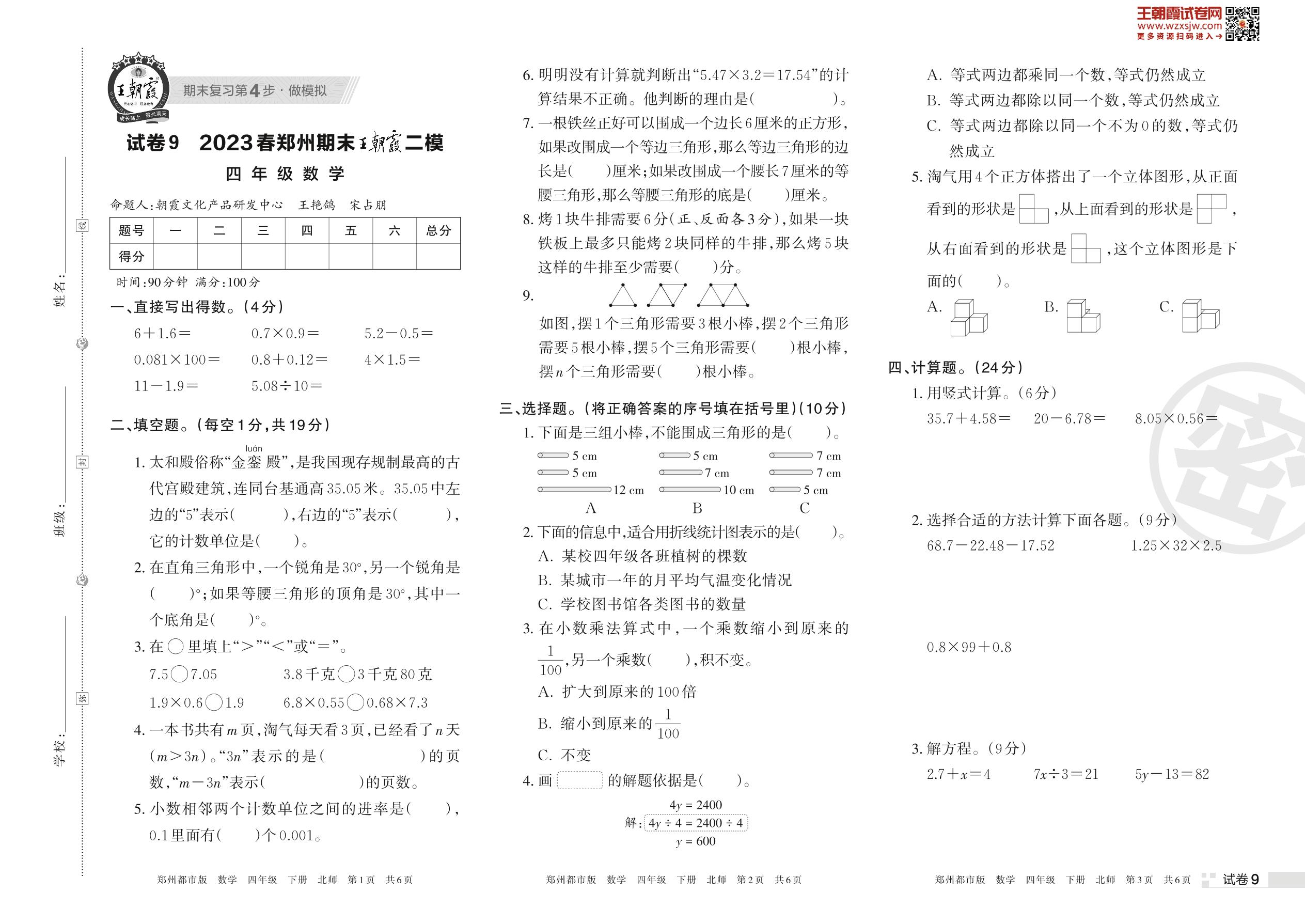 王朝霞期末模拟卷四年级下册数学(北师版)_R230424174533682【9】