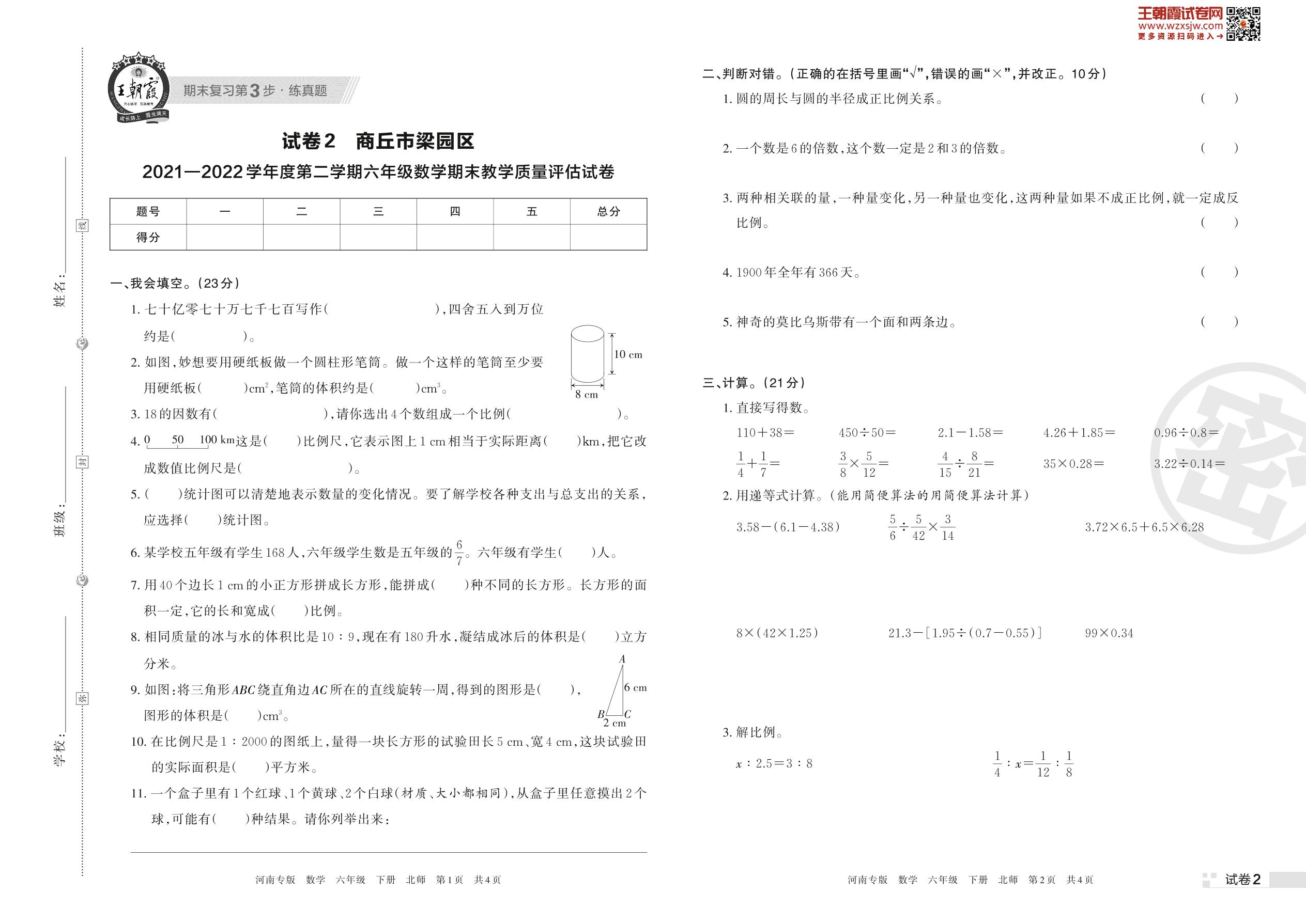 商丘市梁园区2021—2022学年度第二学期六年级数学期末教学质量评估试卷(北师版)【2】
