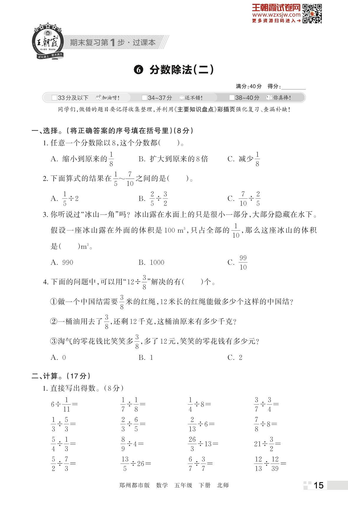 王朝霞期末过课本——6 分数除法(二)五年级下册数学(北师版)