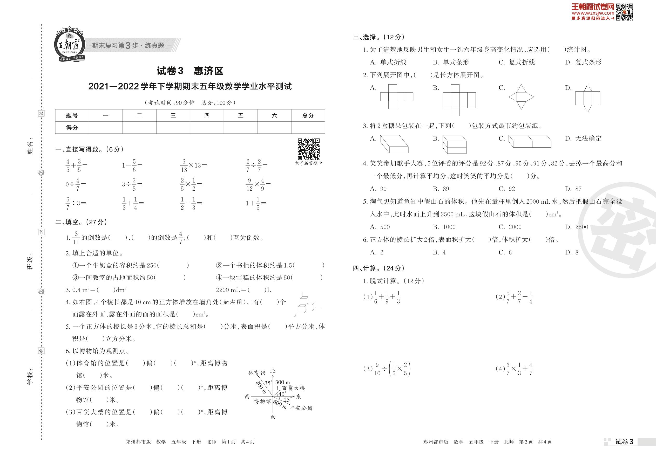 惠济区2021—2022学年下学期期末五年级数学学业水平测试(北师版)【3】