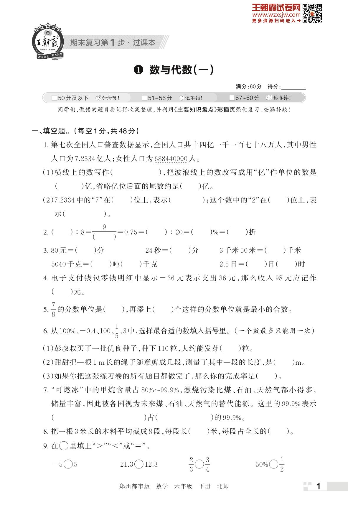 王朝霞期末过课本——1 数与代数(一)六年级下册数学(北师版)