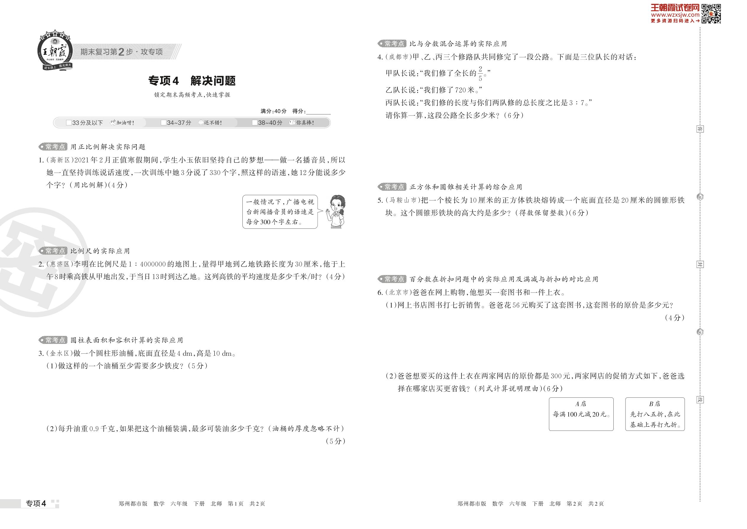 王朝霞期末专项卷——解决问题六年级下册数学(北师版)_R230424175552783【4】
