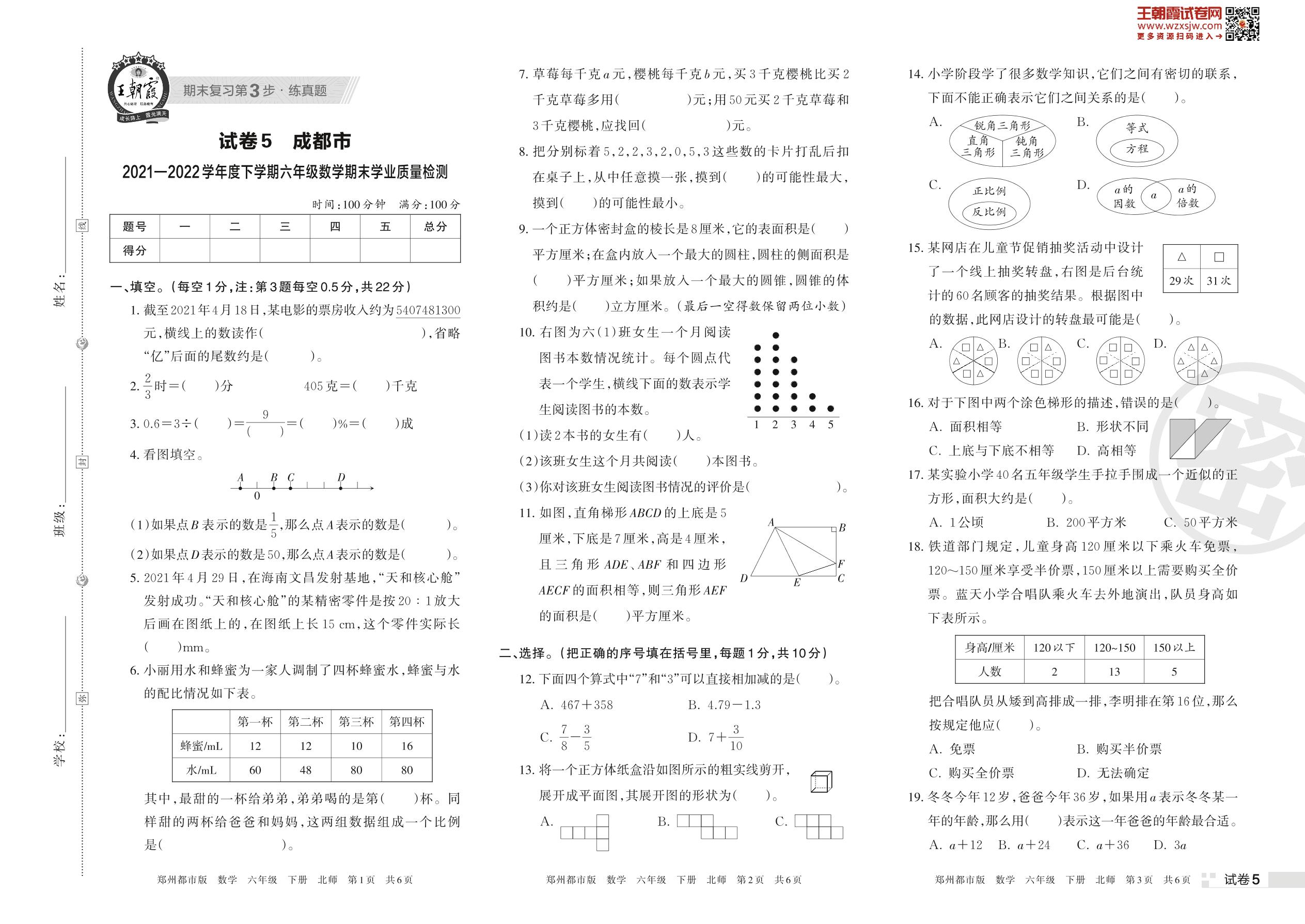 成都市2021—2022学年度下学期六年级数学期末学业质量检测(北师版)【5】