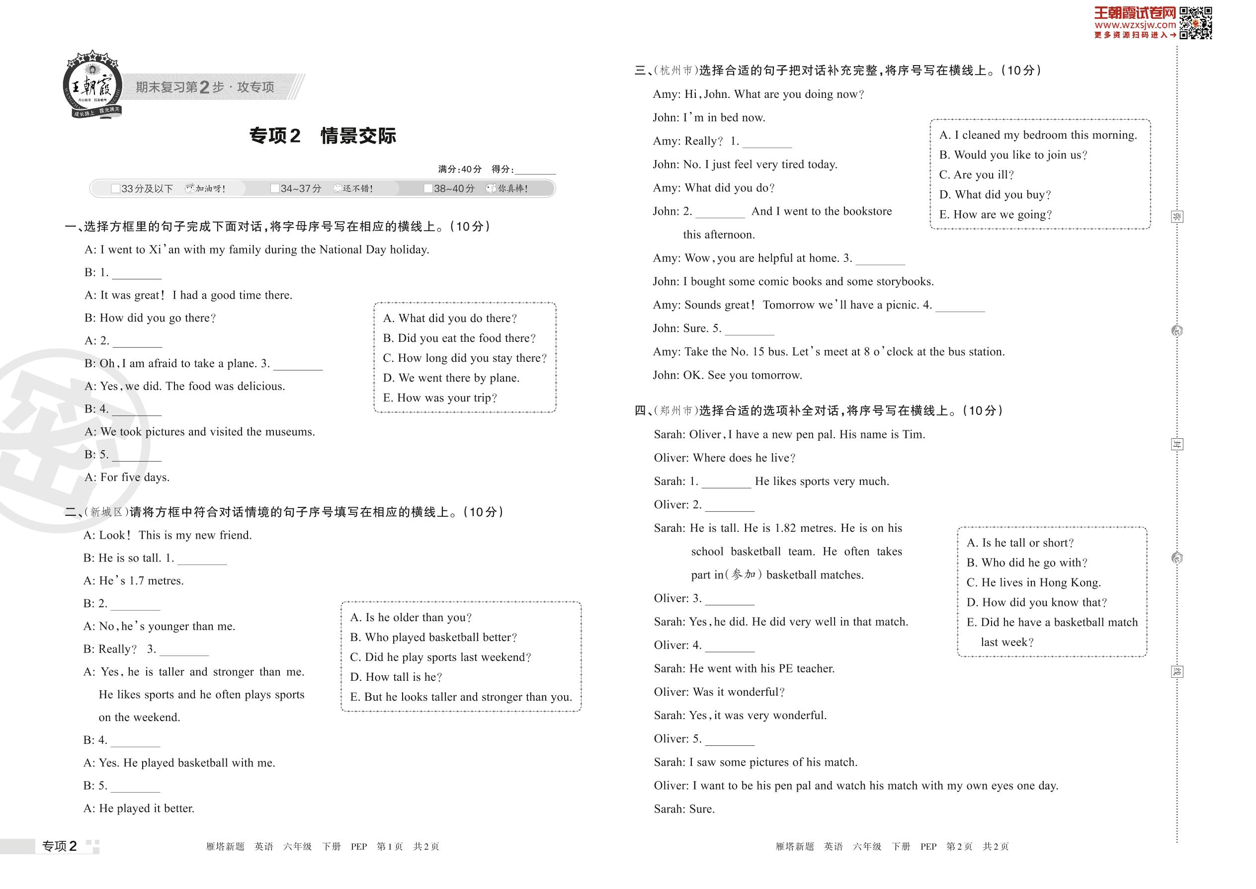 王朝霞期末专项卷——情景交际六年级下册英语(PEP版)_R230425104551462【2】