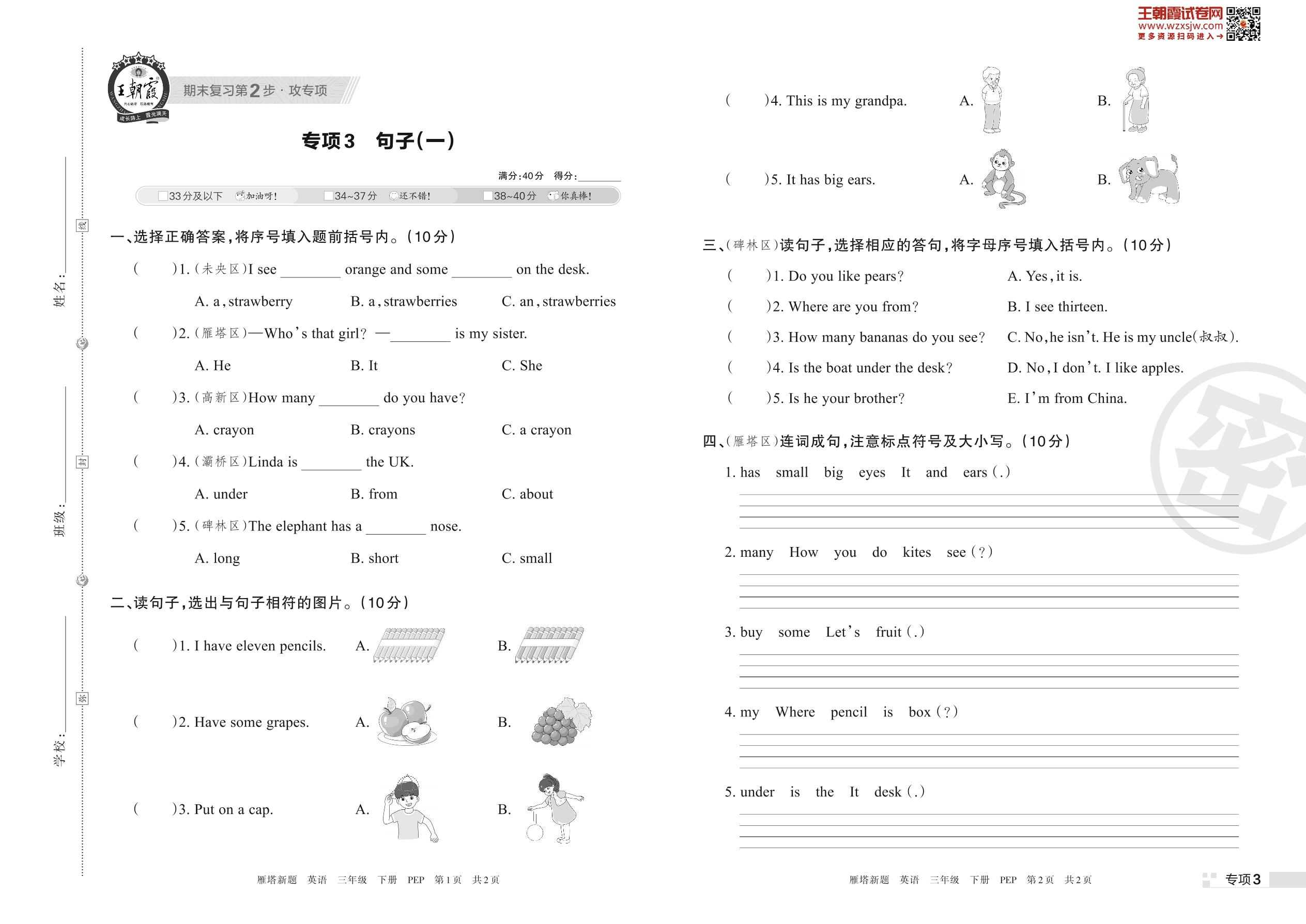 王朝霞期末专项卷——句子(一)三年级下册英语(PEP版)_R230425110148737【3】
