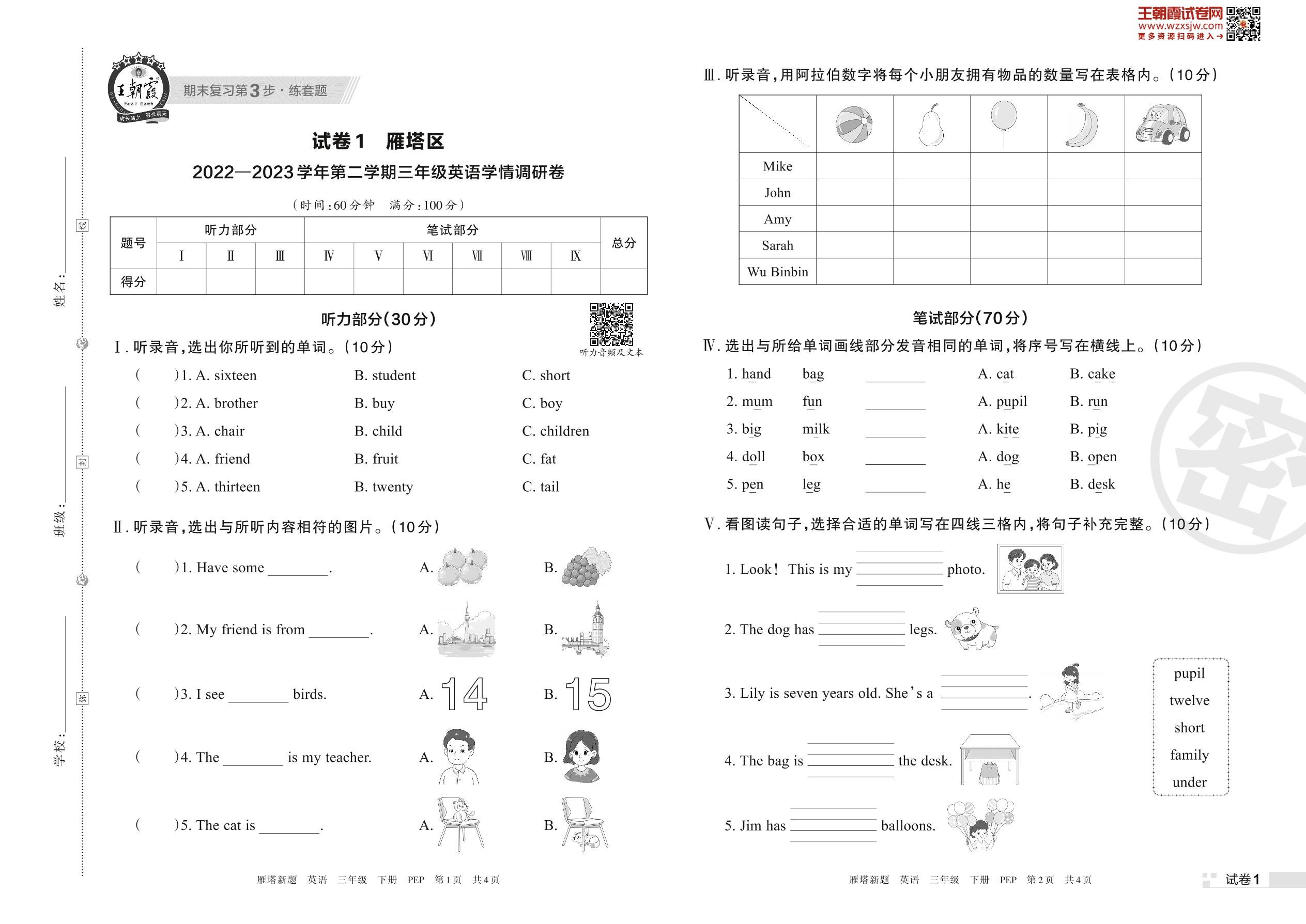 雁塔区2022—2023学年第二学期三年级英语学情调研卷(PEP版)【1】