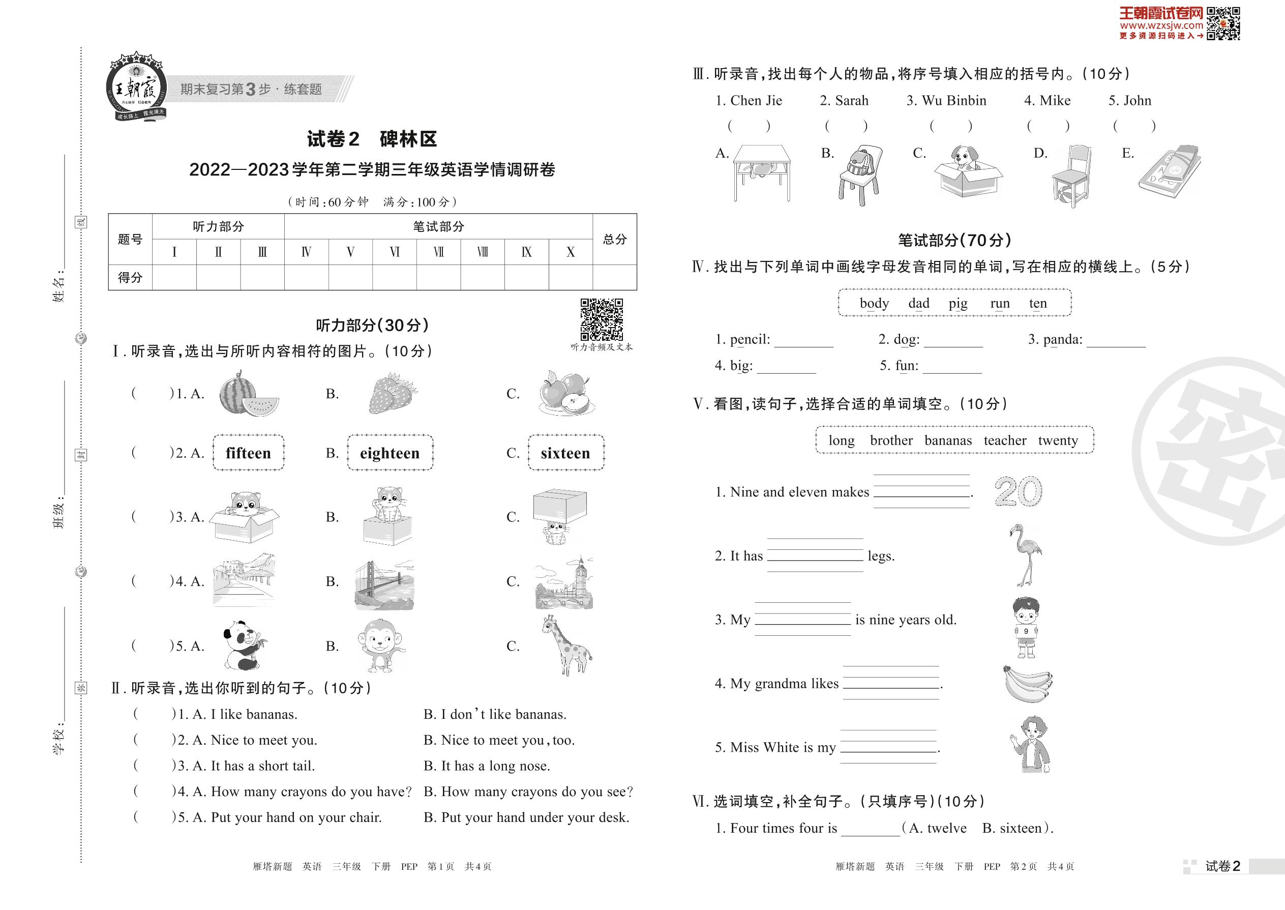 碑林区2022—2023学年第二学期三年级英语学情调研卷(PEP版)【2】