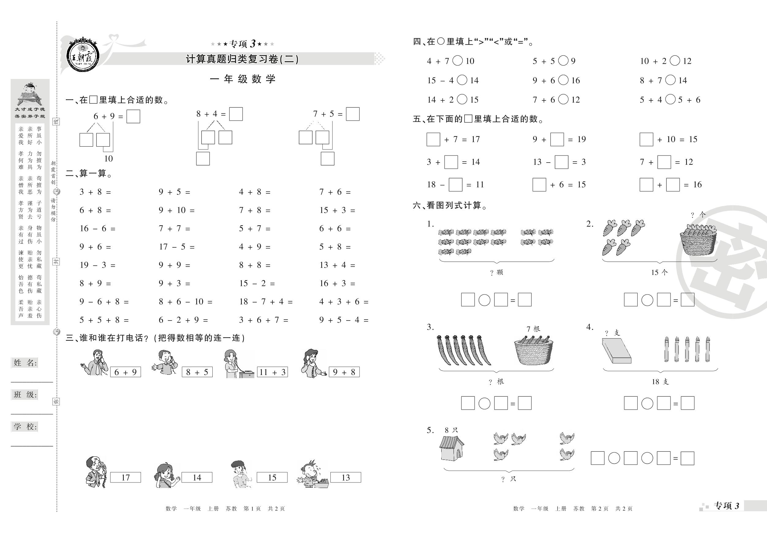 王朝霞期末专项卷——计算、解决问题真题归类复习一年级上册数学(苏教版)_R210802220502【0】