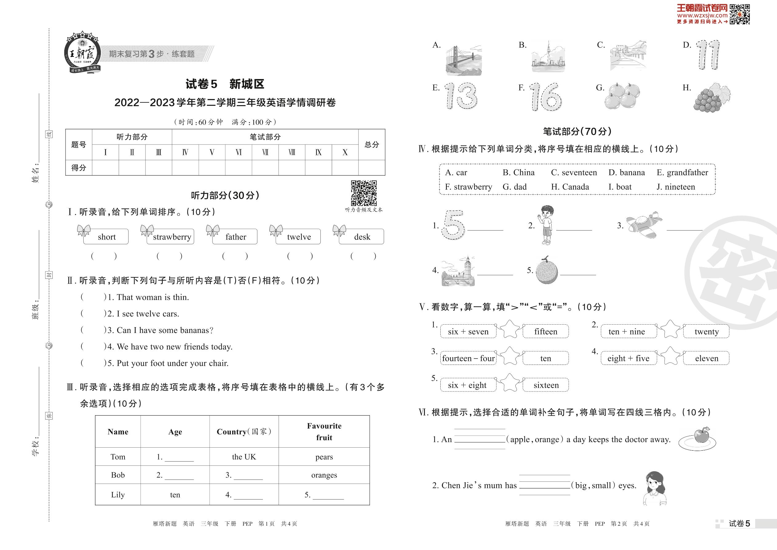 新城区2022—2023学年第二学期三年级英语学情调研卷(PEP版)【5】