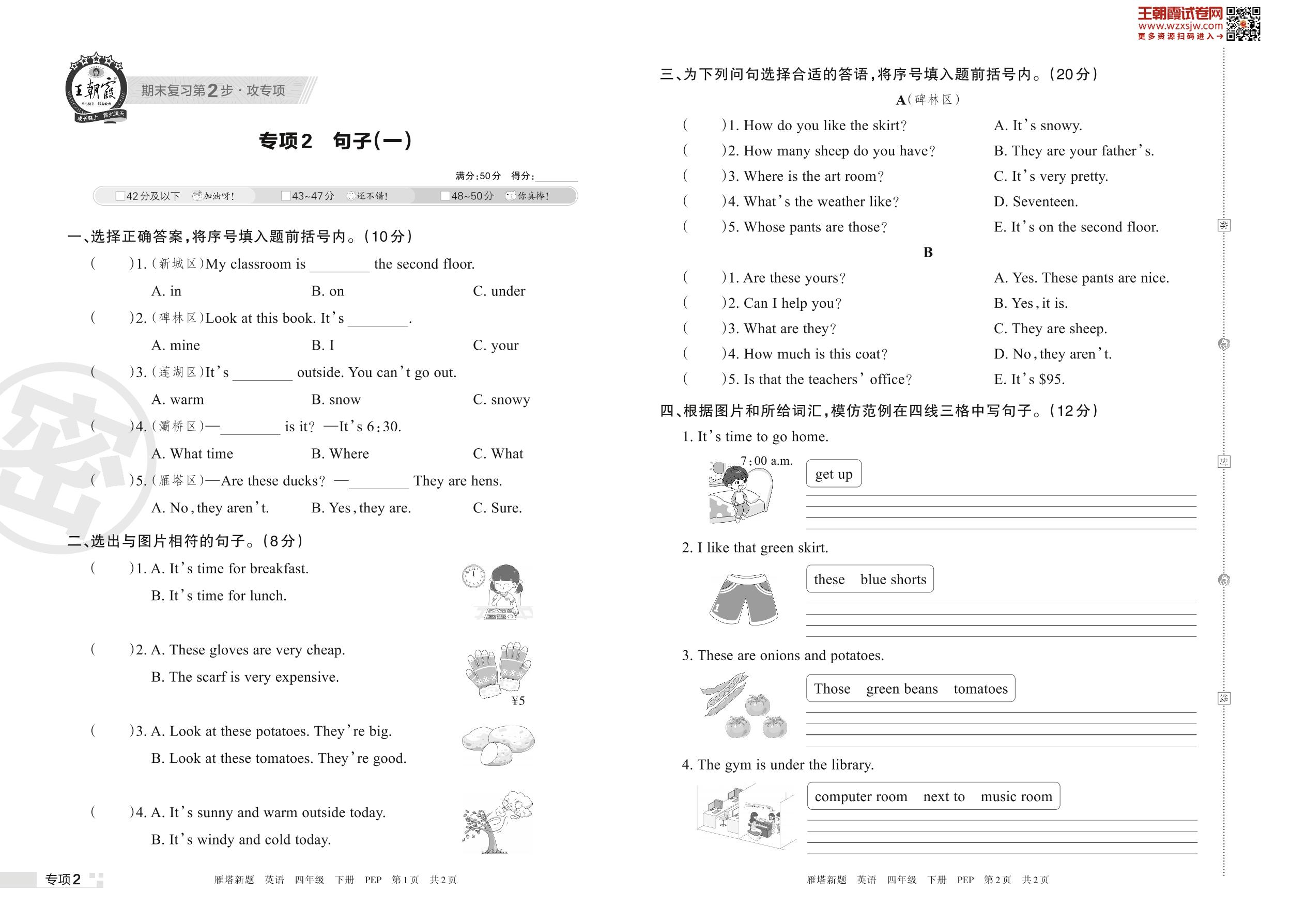 王朝霞期末专项卷——句子(一)四年级下册英语(PEP版)_R230425110930509【2】