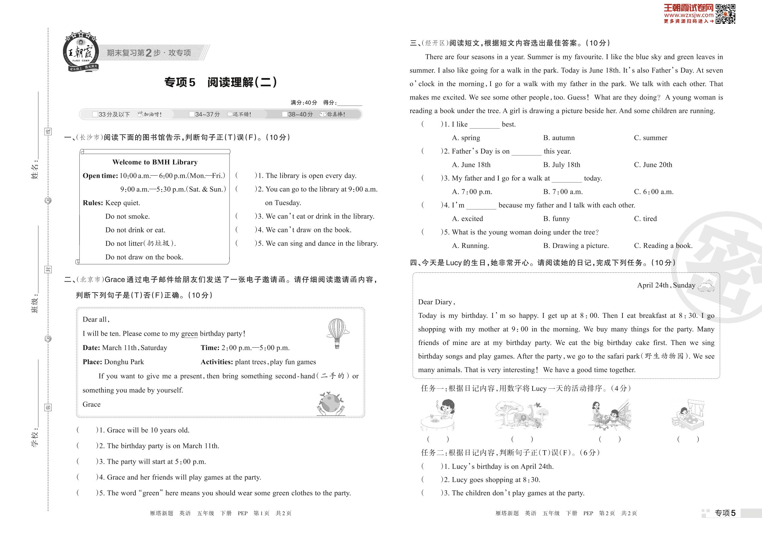 王朝霞期末专项卷——阅读理解(二)五年级下册英语(PEP版)_R230425112828532【5】