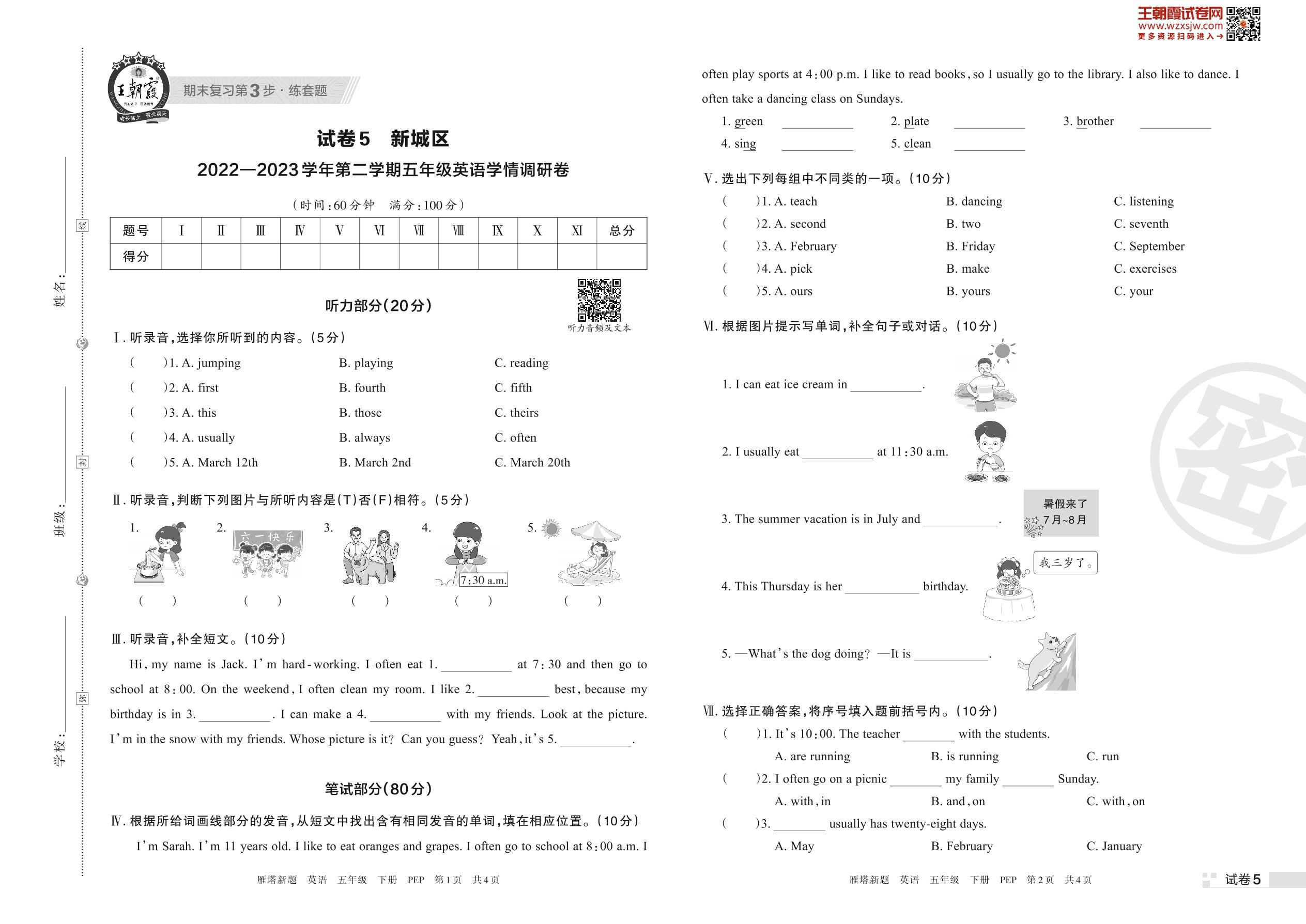 新城区2022—2023学年第二学期五年级英语学情调研卷(PEP版)【5】