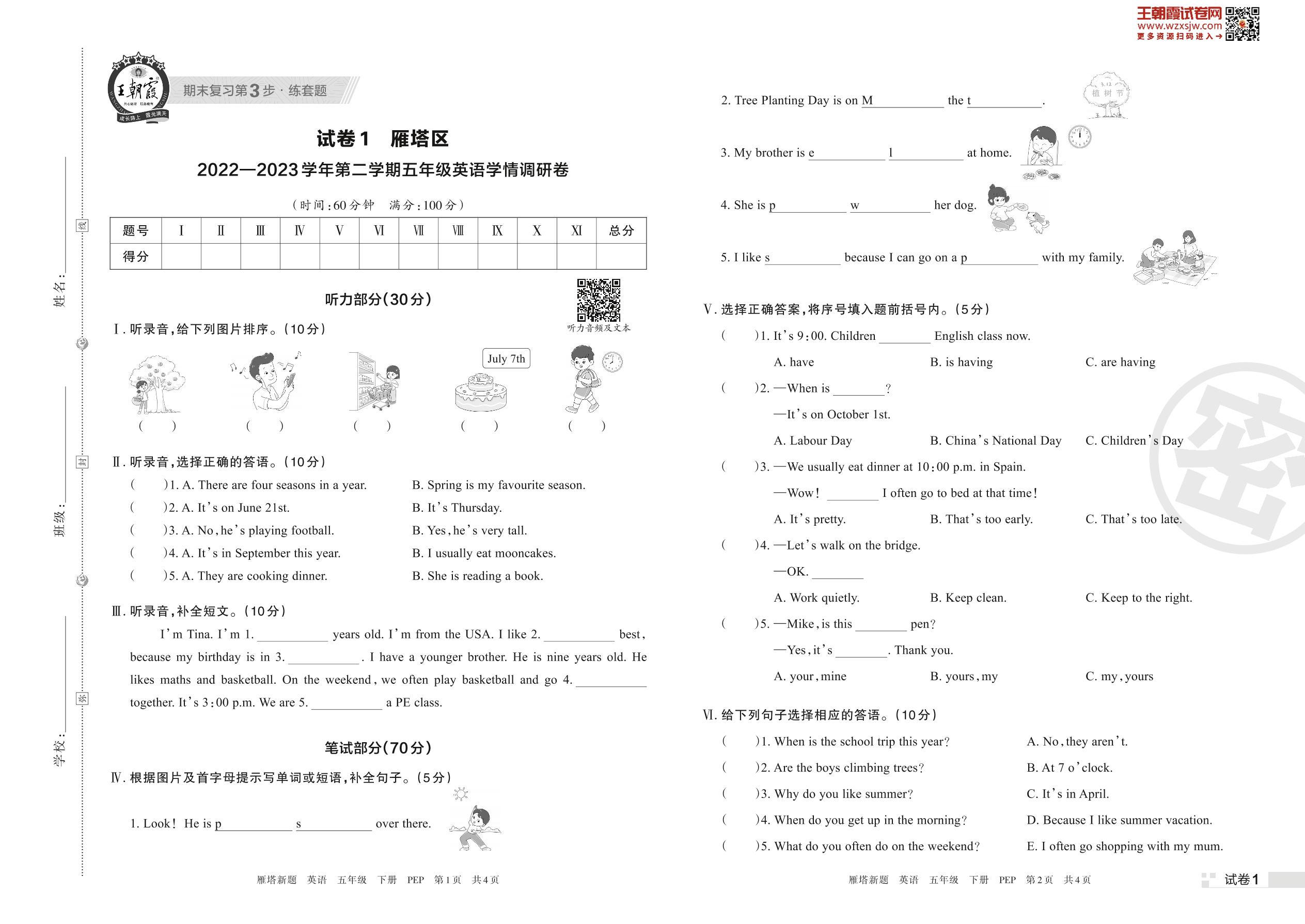 雁塔区2022—2023学年第二学期五年级英语学情调研卷(PEP版)【1】