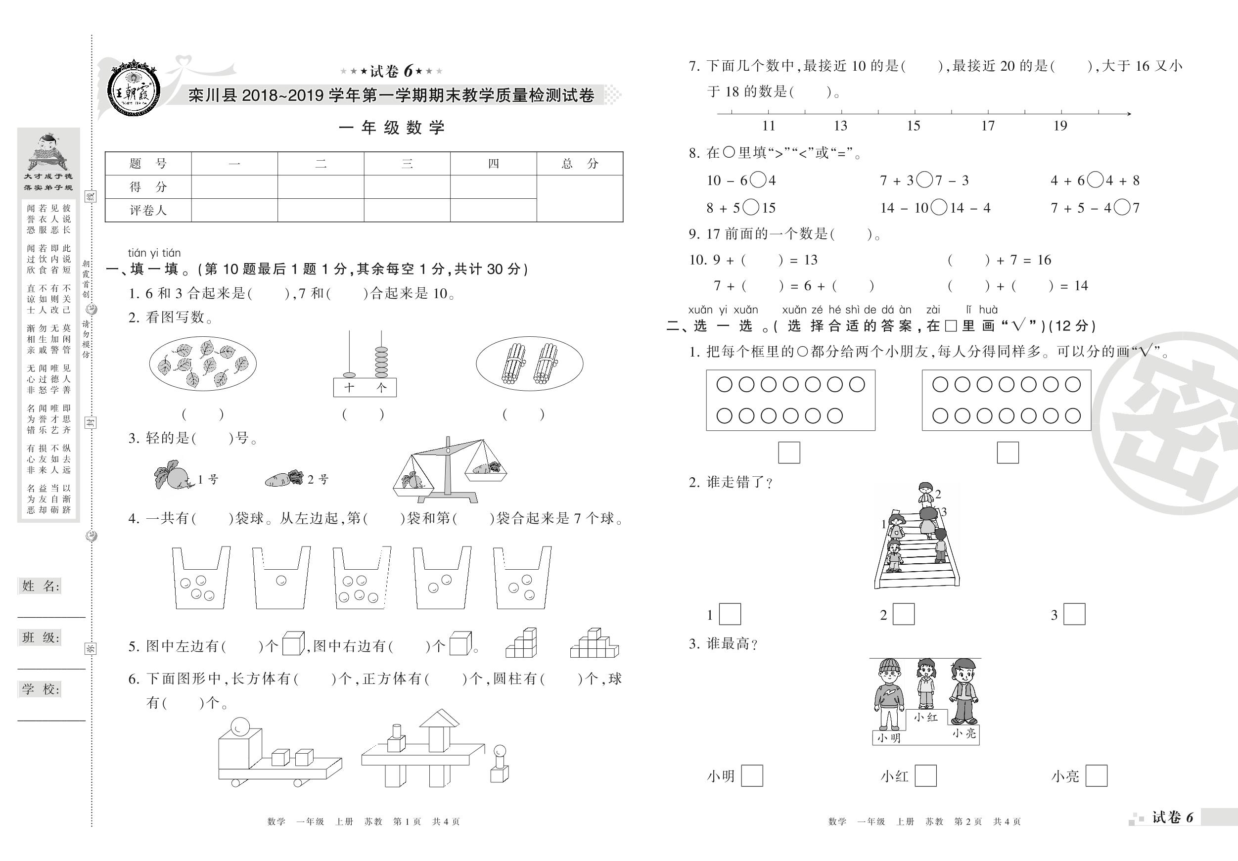 2018-2019学年第一学期洛阳市栾川县一年级数学试卷(冀教版)【6】