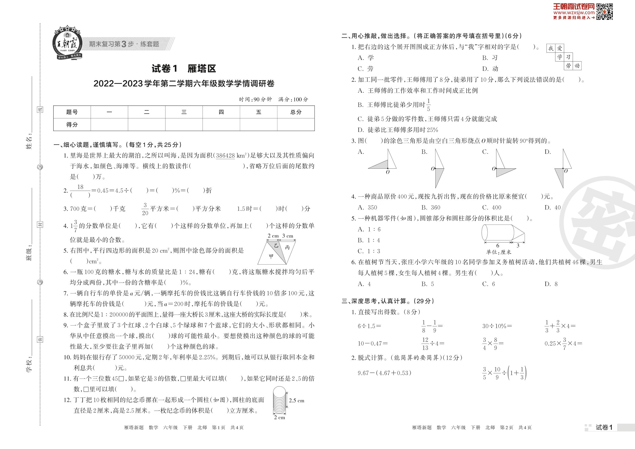 雁塔区2022—2023学年第二学期六年级数学学情调研卷(北师版)【1】