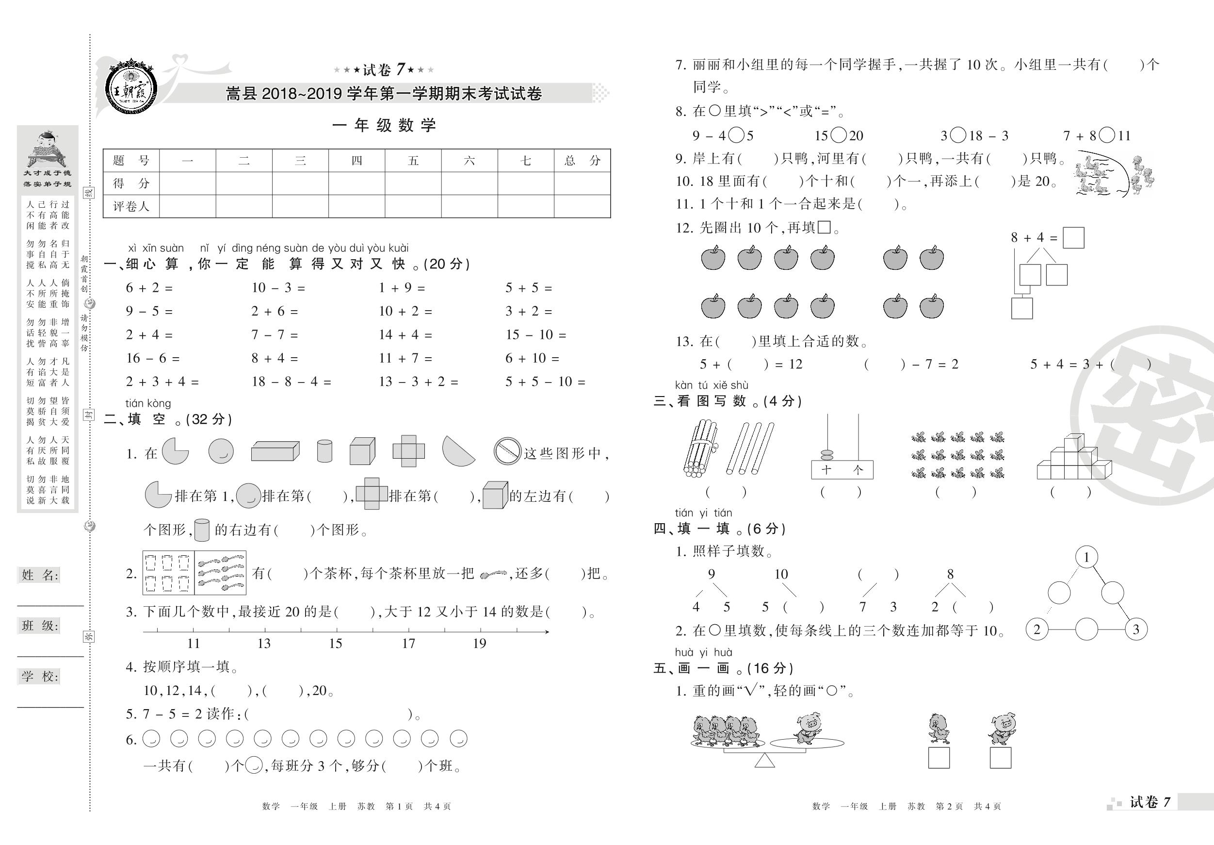 2018-2019学年第一学期洛阳市嵩县一年级数学试卷(冀教版)【7】