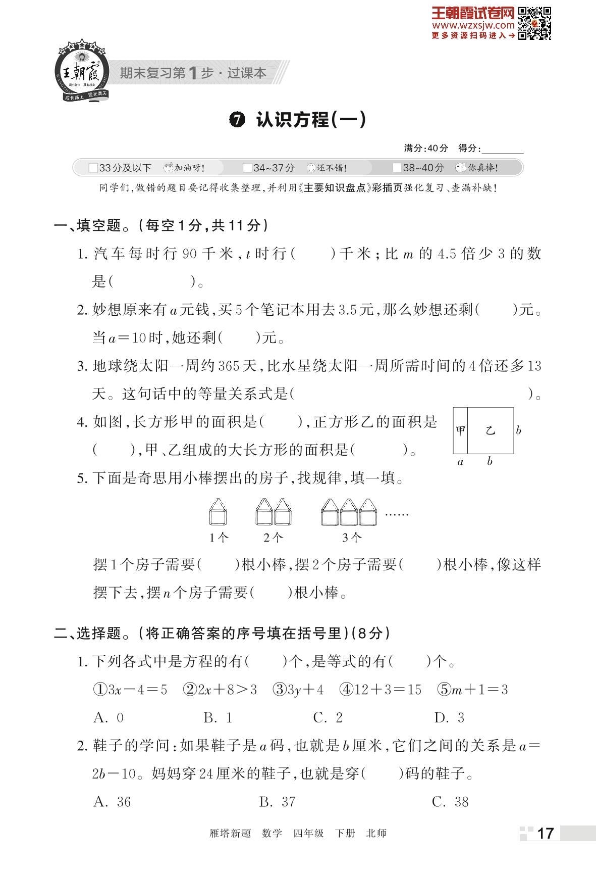 王朝霞期末过课本——7 认识方程(一)四年级下册数学(北师版)_R230425115645442