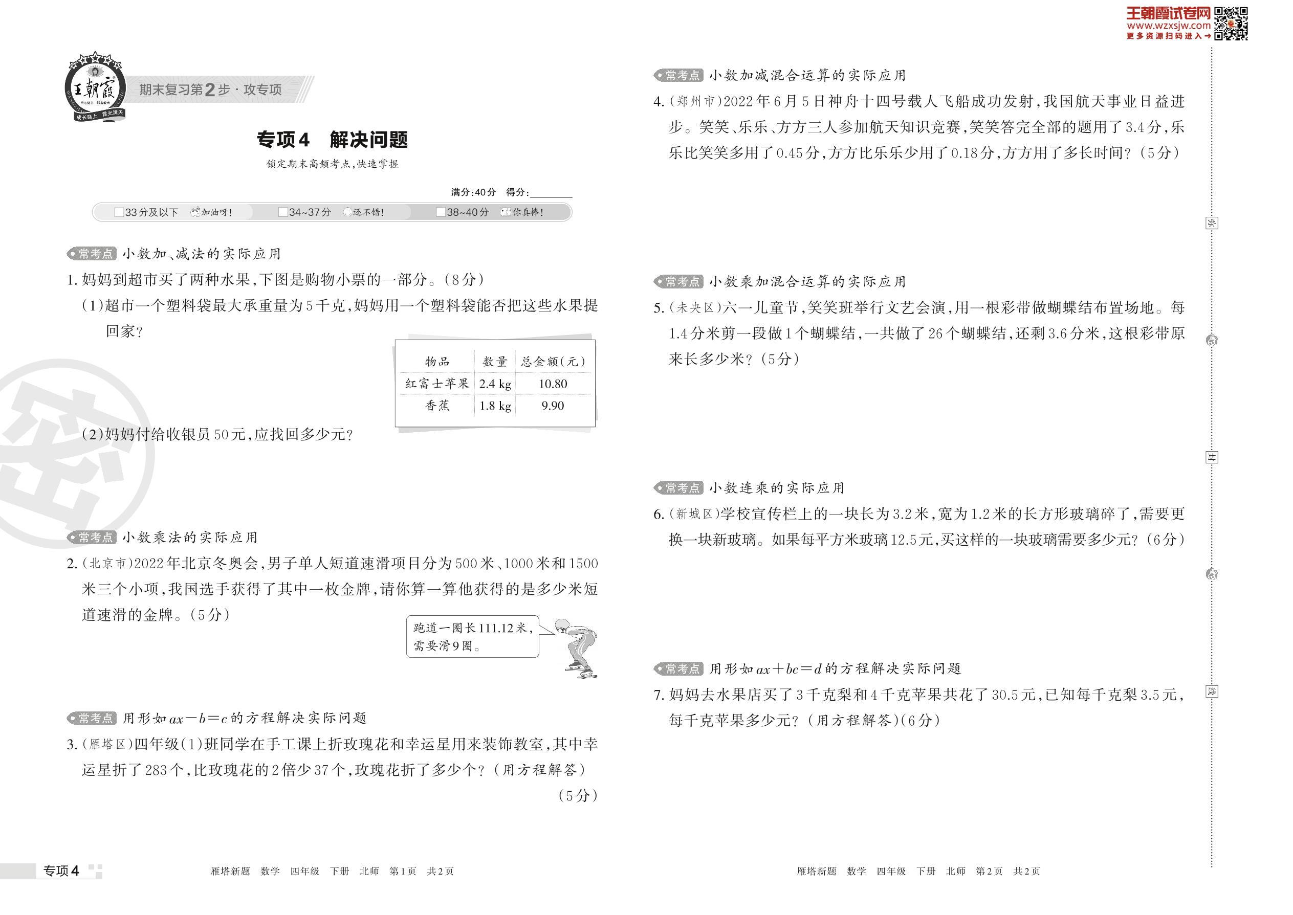王朝霞期末专项卷——解决问题四年级下册数学(北师版)_R230425115647381【4】