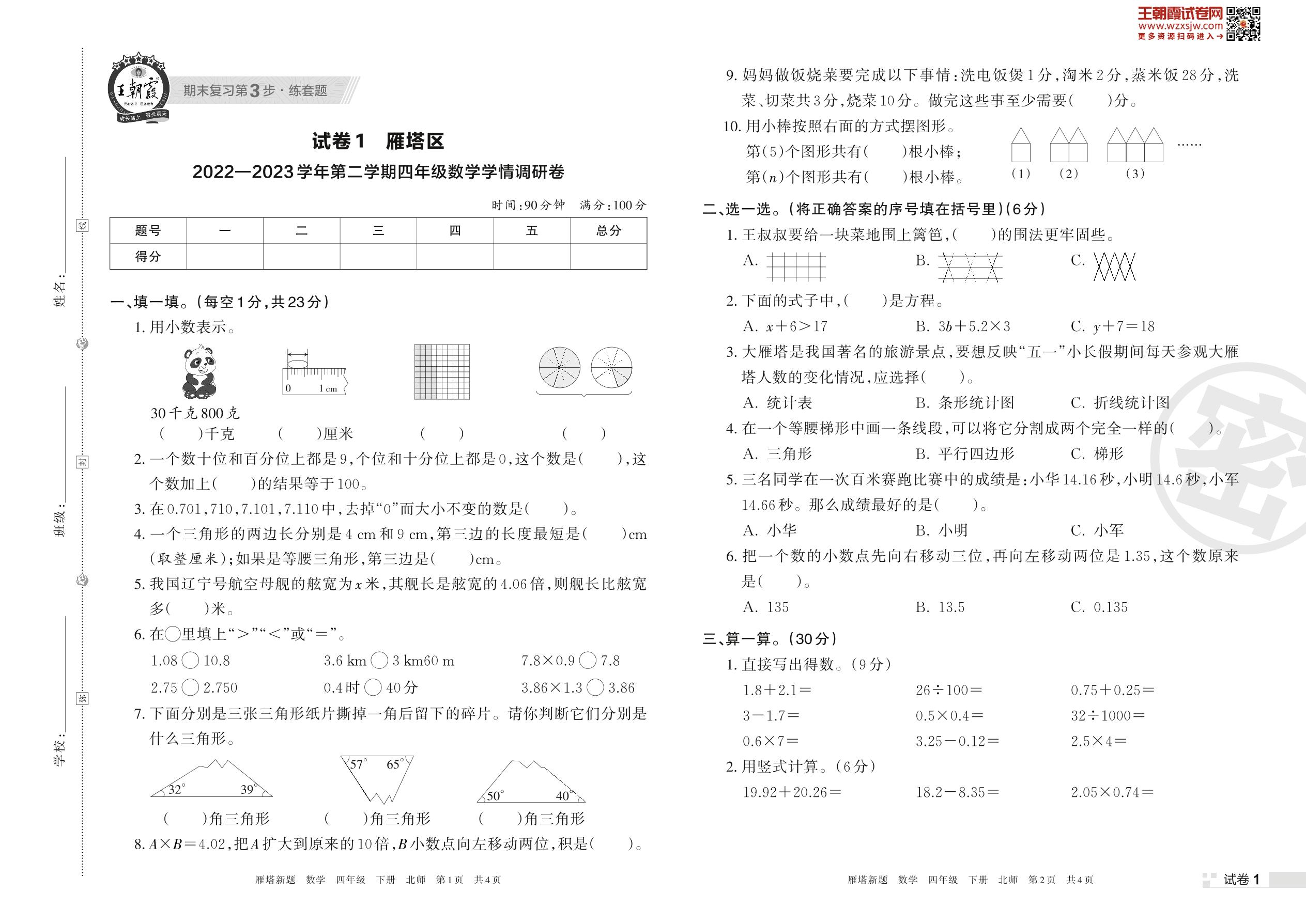 雁塔区2022—2023学年第二学期四年级数学学情调研卷(北师版)【1】