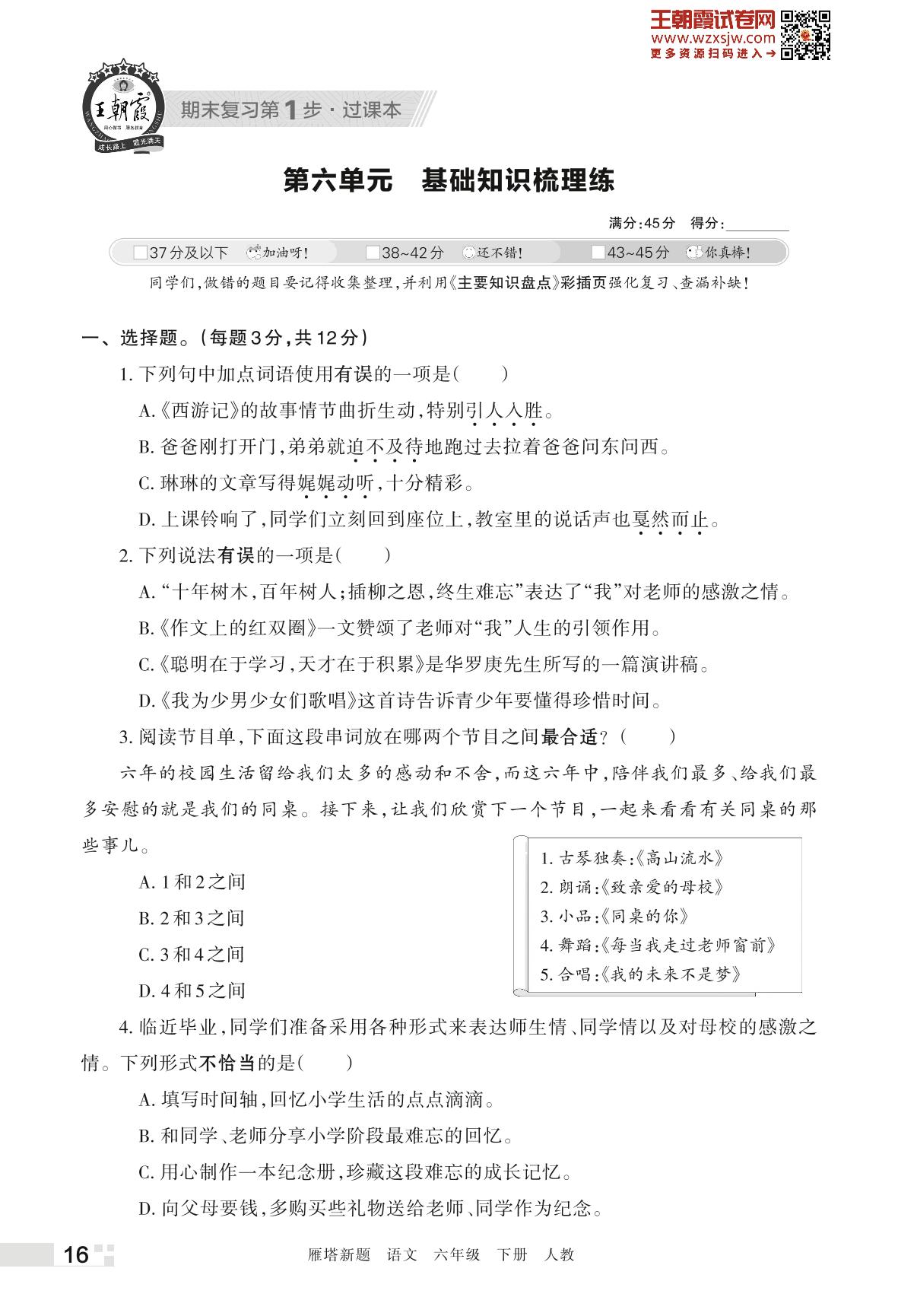 王朝霞期末过课本——第六单元 基础知识梳理练六年级下册语文(人教版)_R230425135308801
