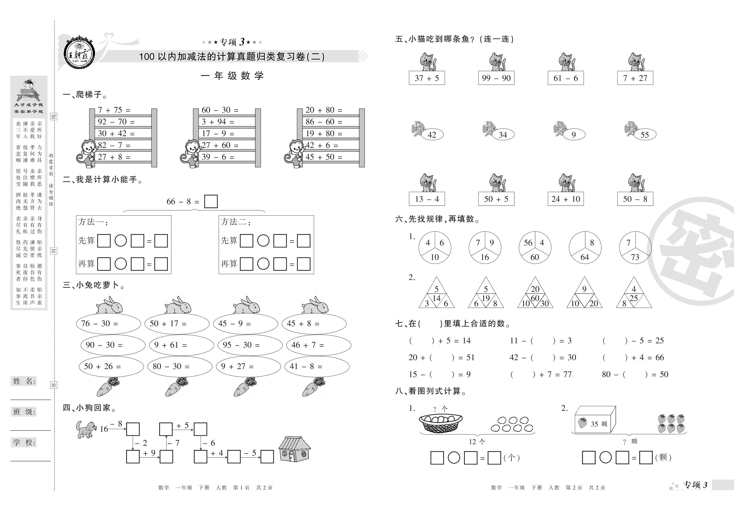 王朝霞期末专项卷——100以内加减法的计算(二)、解决问题真题归类复习卷一年级下册数学(人教版)_R210802220551【0】