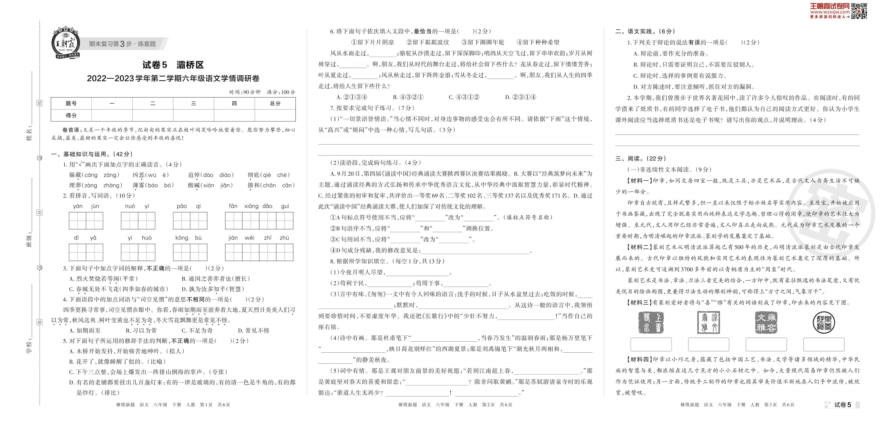 灞桥区2022—2023学年第二学期六年级语文学情调研卷(人教版)【5】