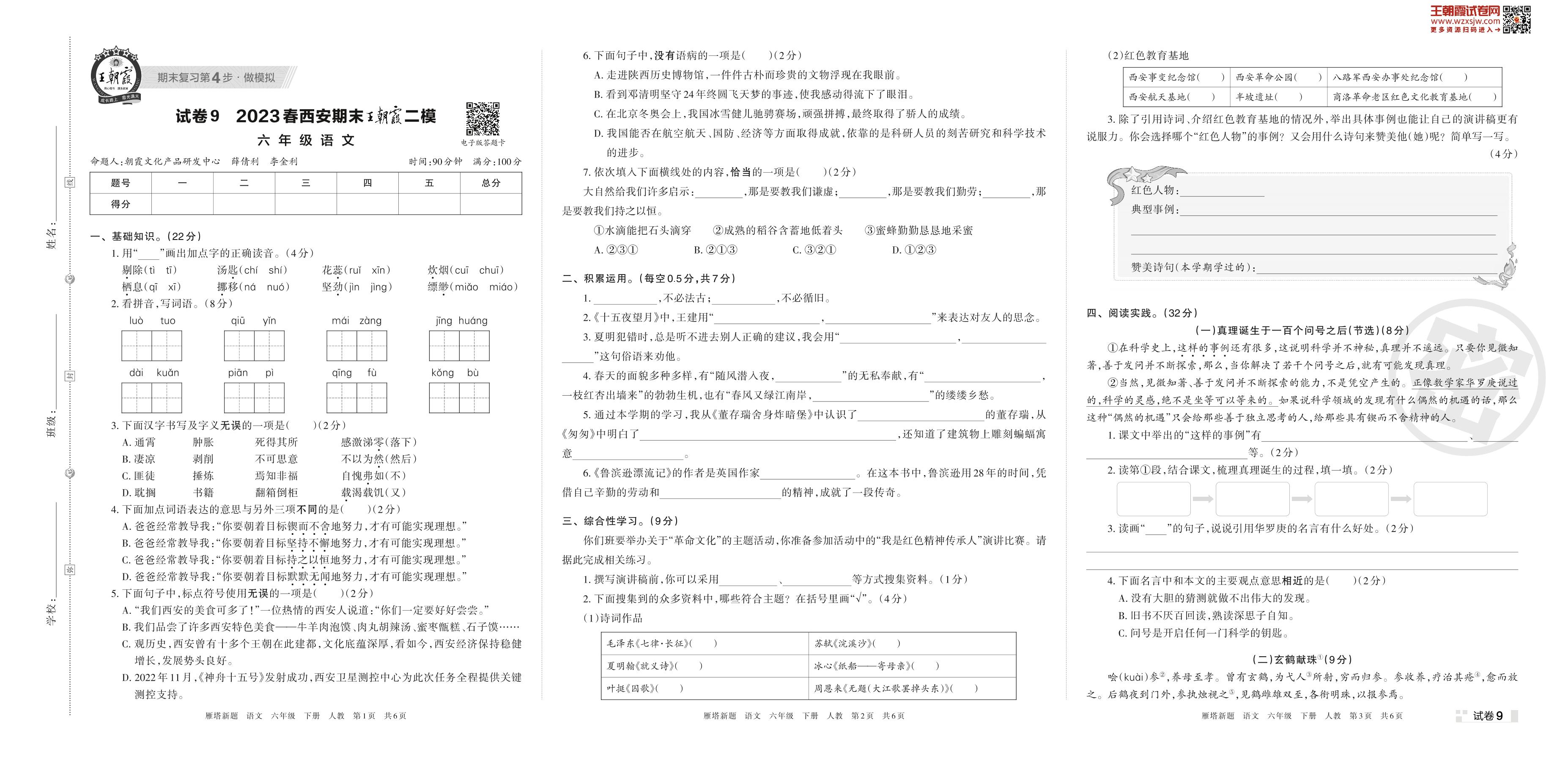 王朝霞期末模拟卷六年级下册语文(人教版)_R230425135310316【9】