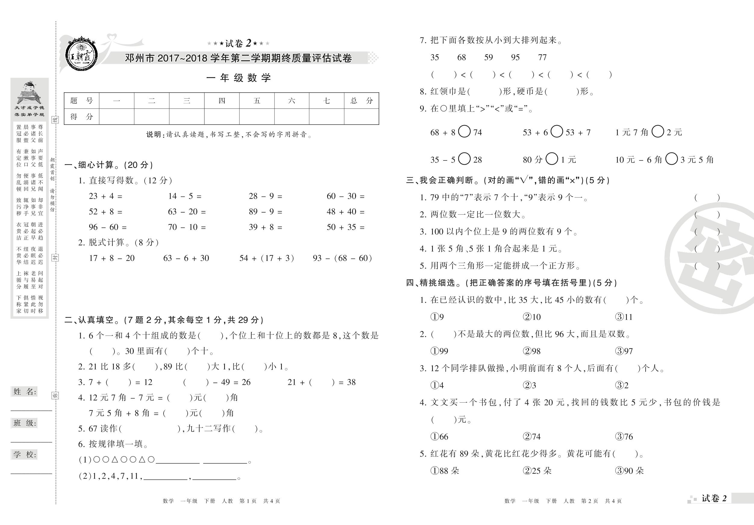 2017-2018学年第二学期邓州市一年级数学试卷(人教版)【2】