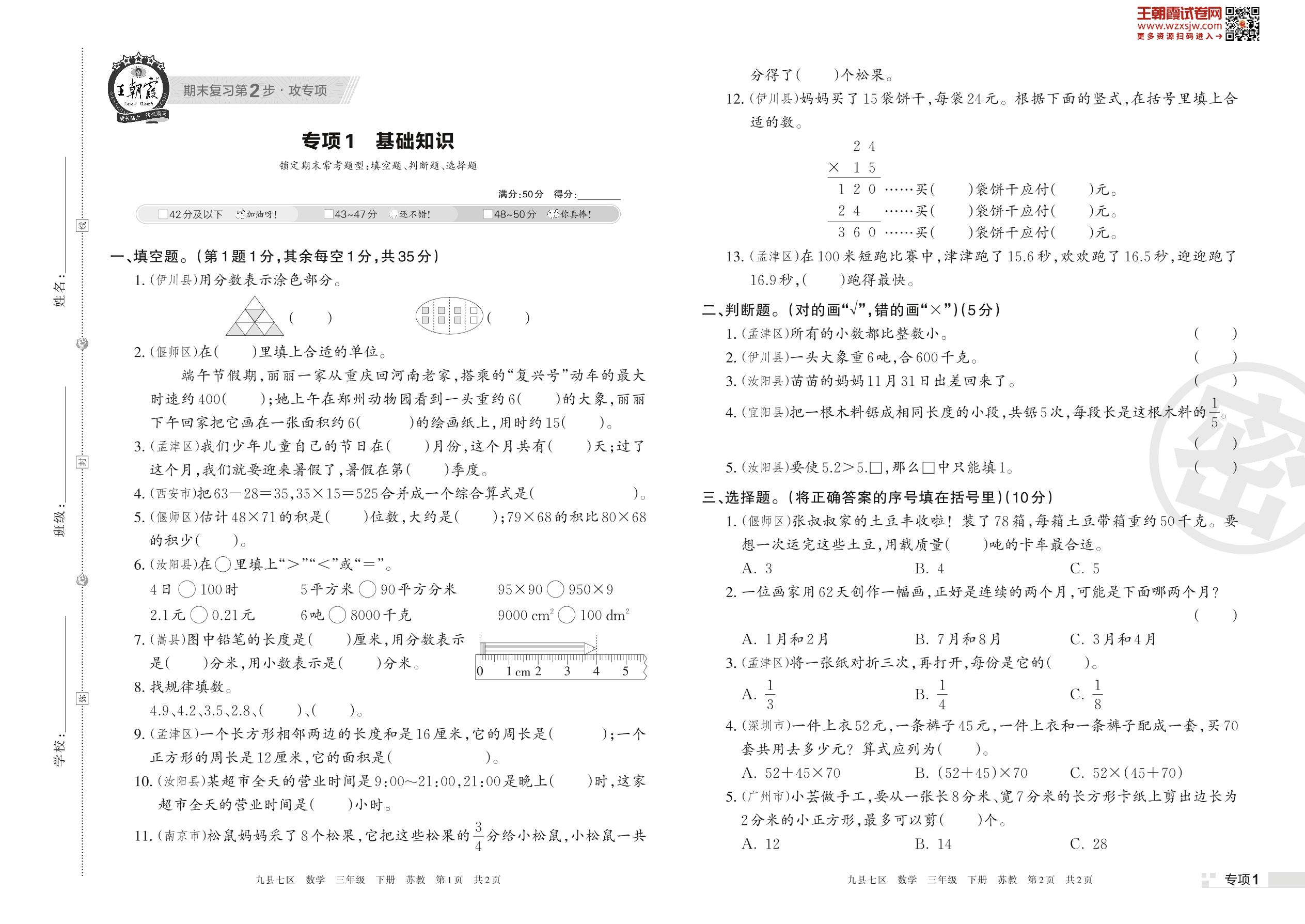 王朝霞期末专项卷——基础知识三年级下册数学(苏教版)_R230425135533240【1】