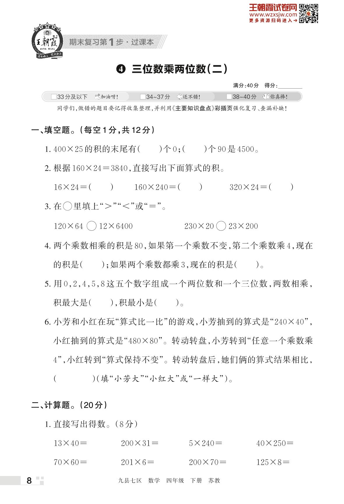 王朝霞期末过课本——4 三位数乘两位数(二)四年级下册数学(苏教版)_R230425140117811