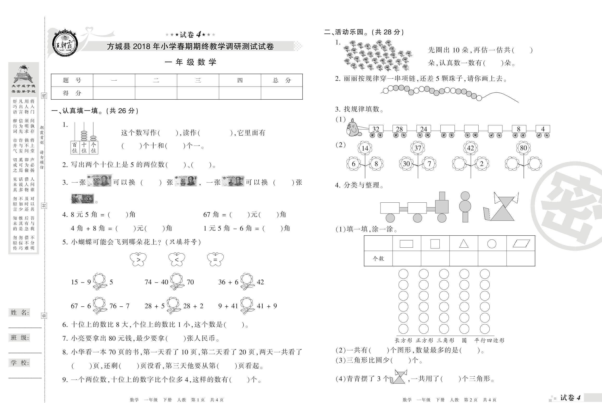 2017-2018学年第二学期南阳市方城县一年级数学试卷(人教版)【4】