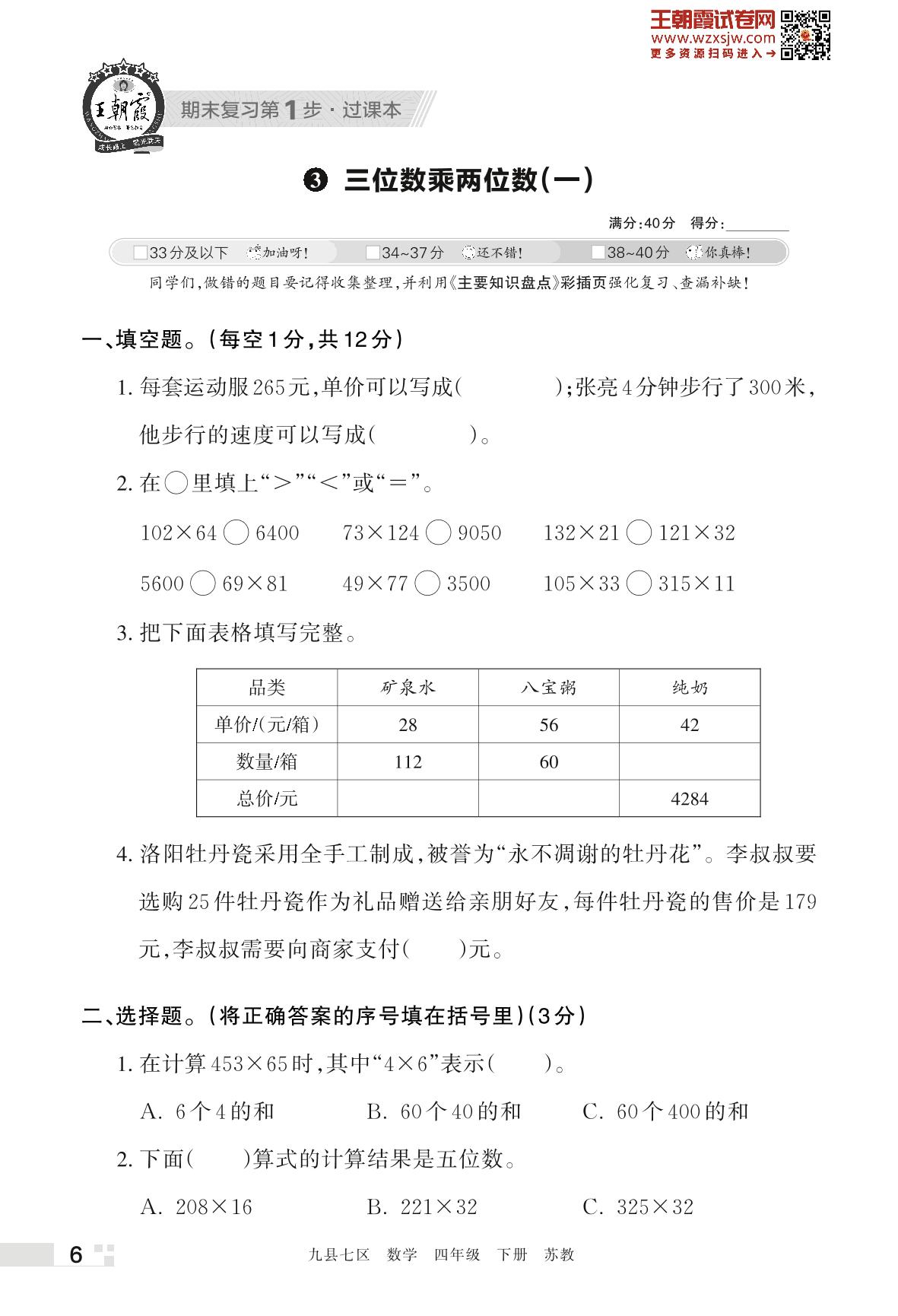 王朝霞期末过课本——3 三位数乘两位数(一)四年级下册数学(苏教版)_R230425140117931