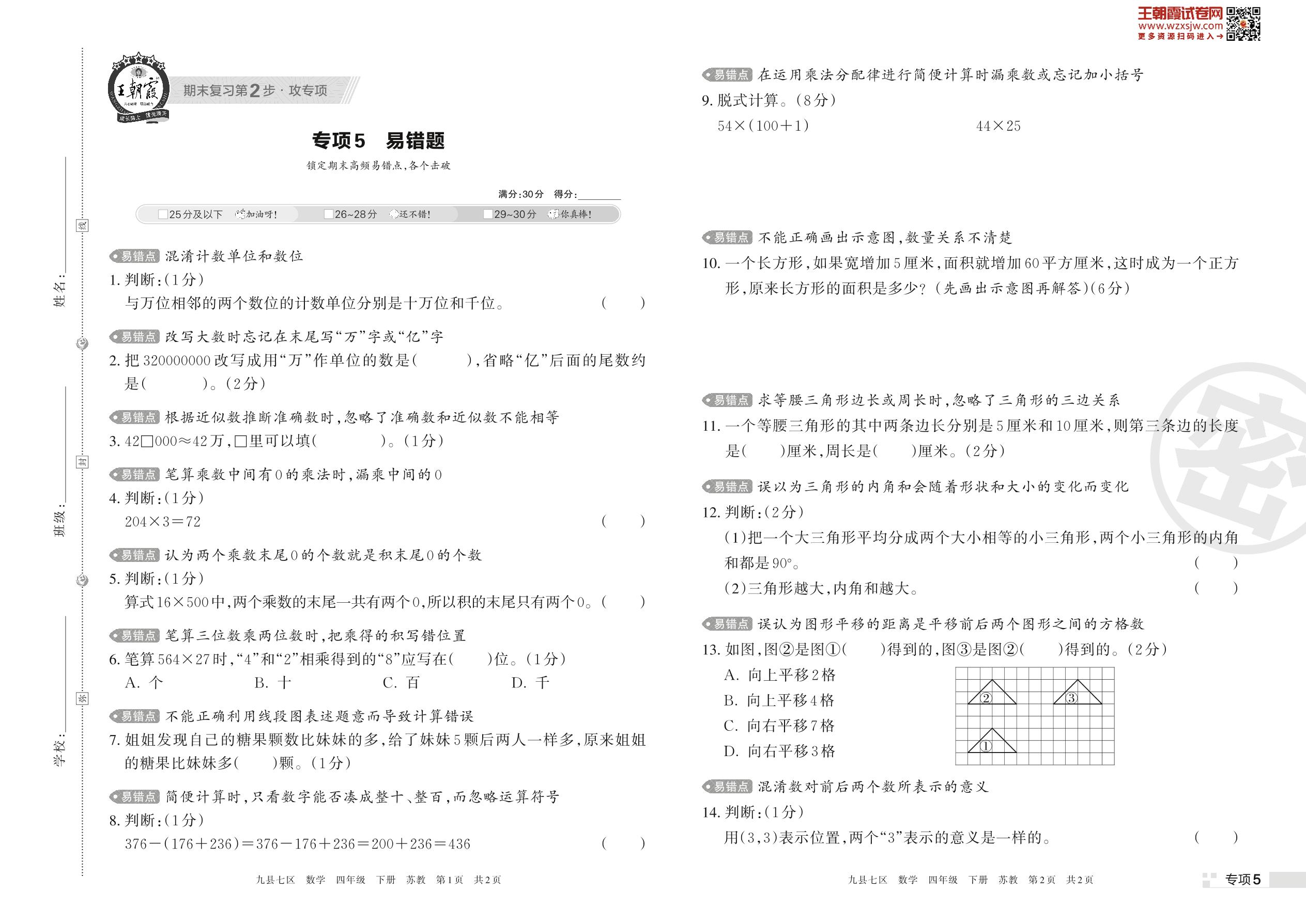 王朝霞期末专项卷——易错题四年级下册数学(苏教版)_R230425140118835【5】