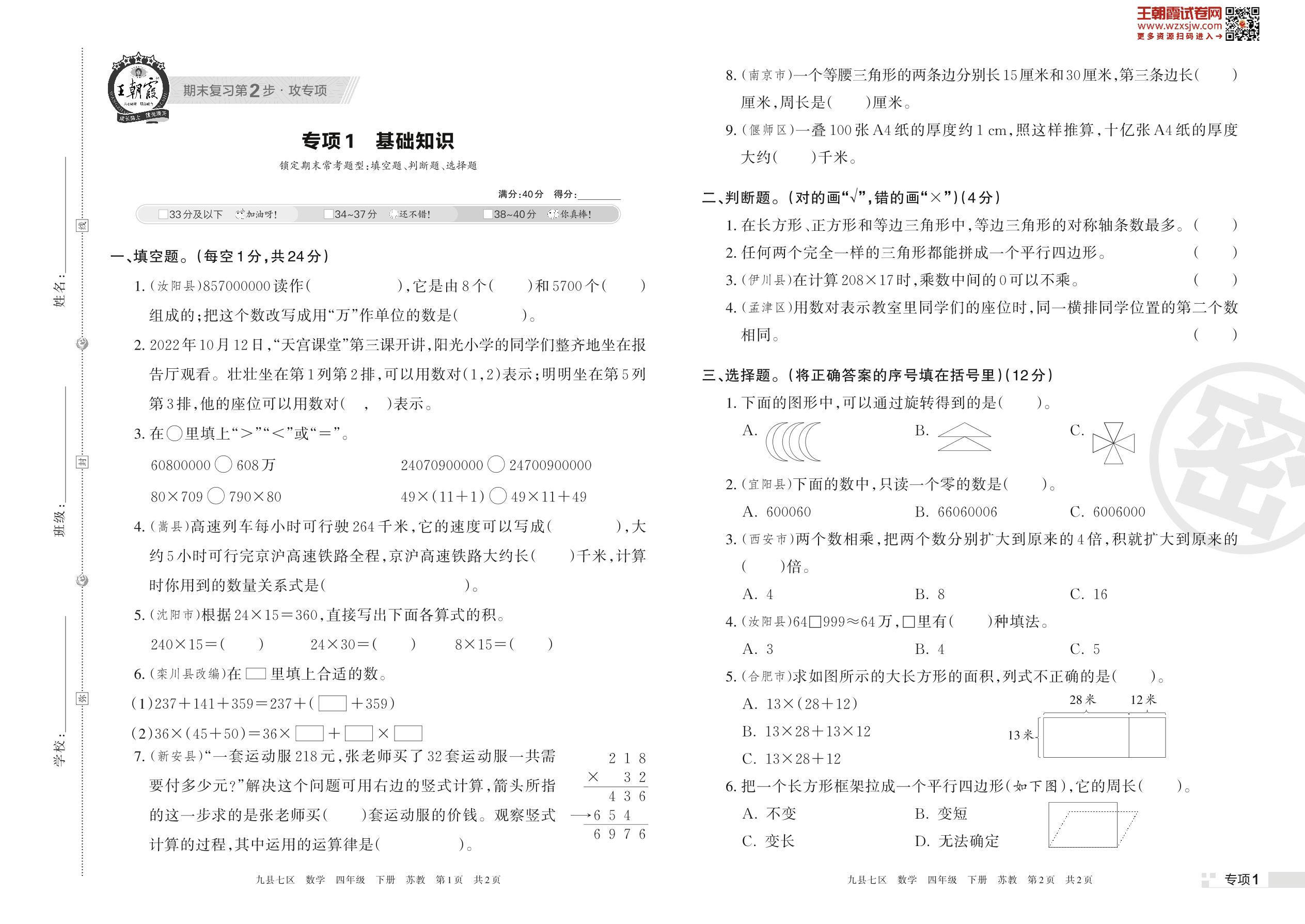 王朝霞期末专项卷——基础知识四年级下册数学(苏教版)_R230425140118397【1】