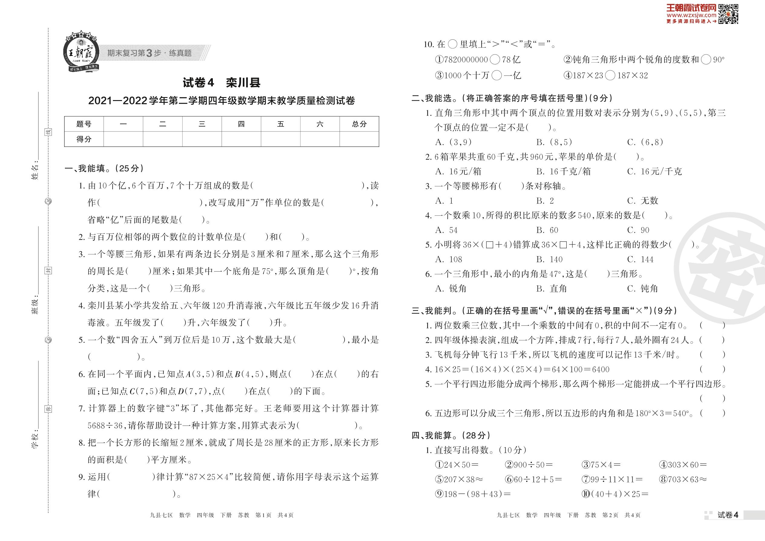 栾川县2021—2022学年第二学期四年级数学期末教学质量检测试卷(苏教版)【4】