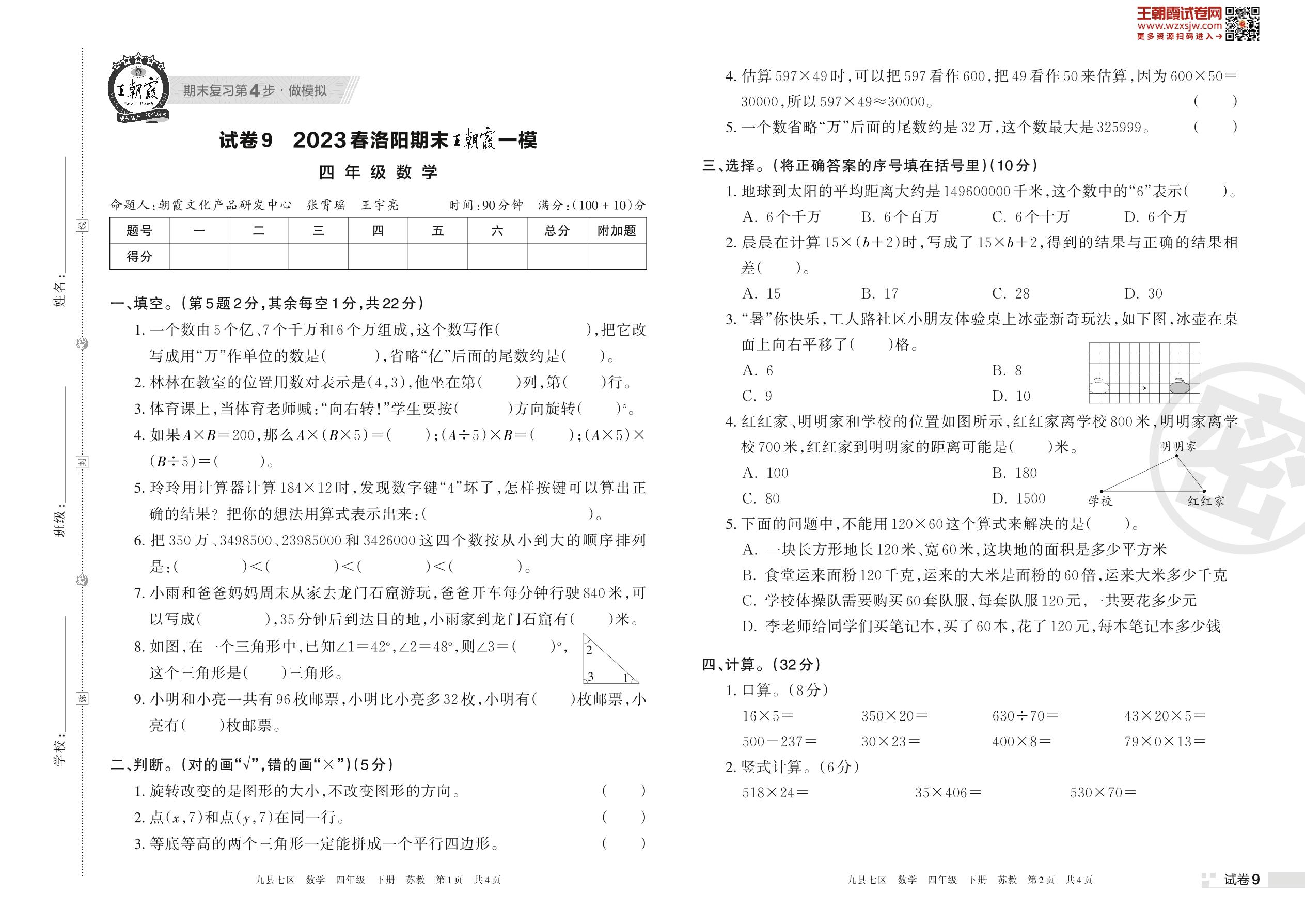 王朝霞期末模拟卷四年级下册数学(苏教版)_R230425140120465【9】