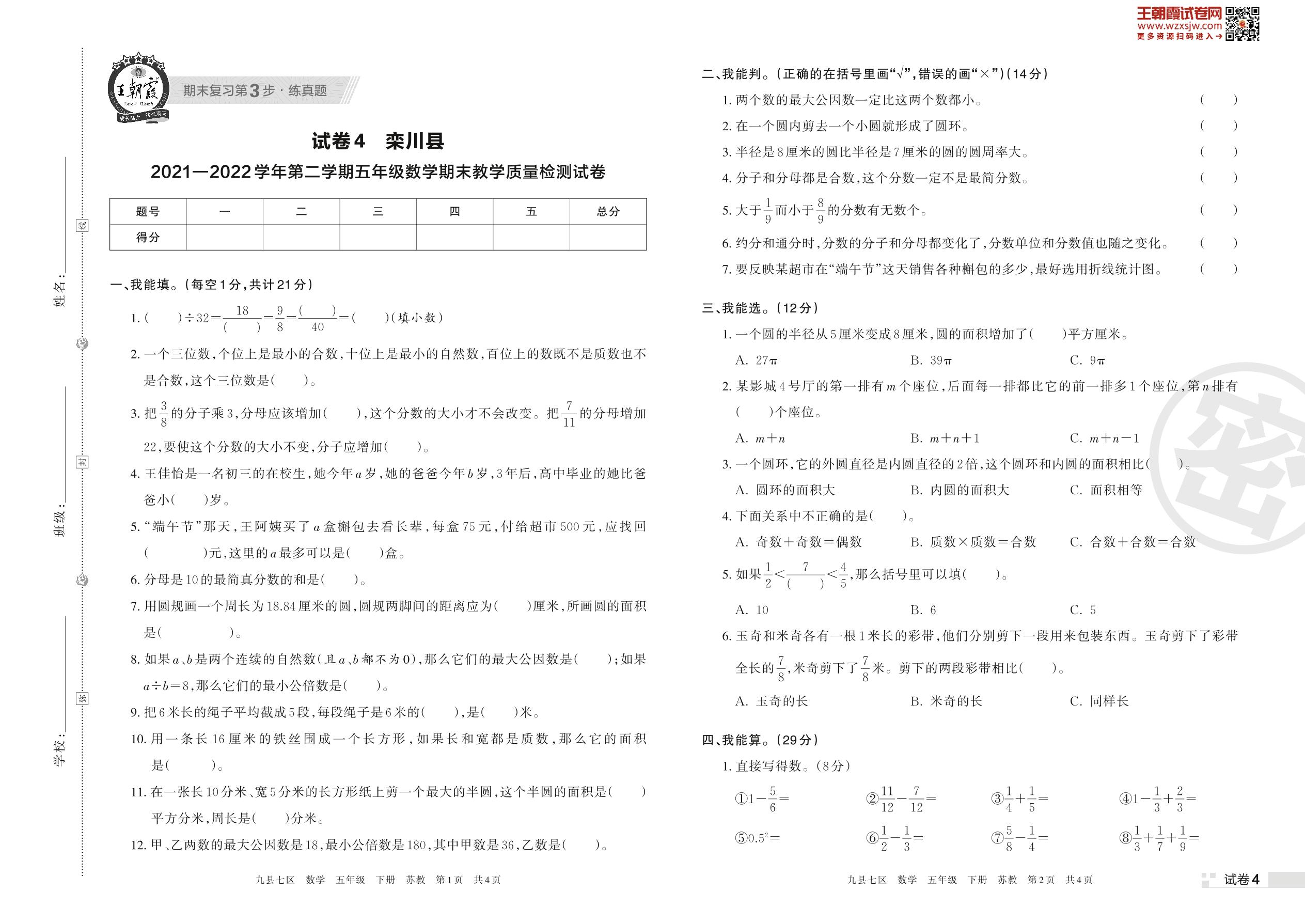 栾川县2021—2022学年第二学期五年级数学期末教学质量检测试卷(苏教版)【4】