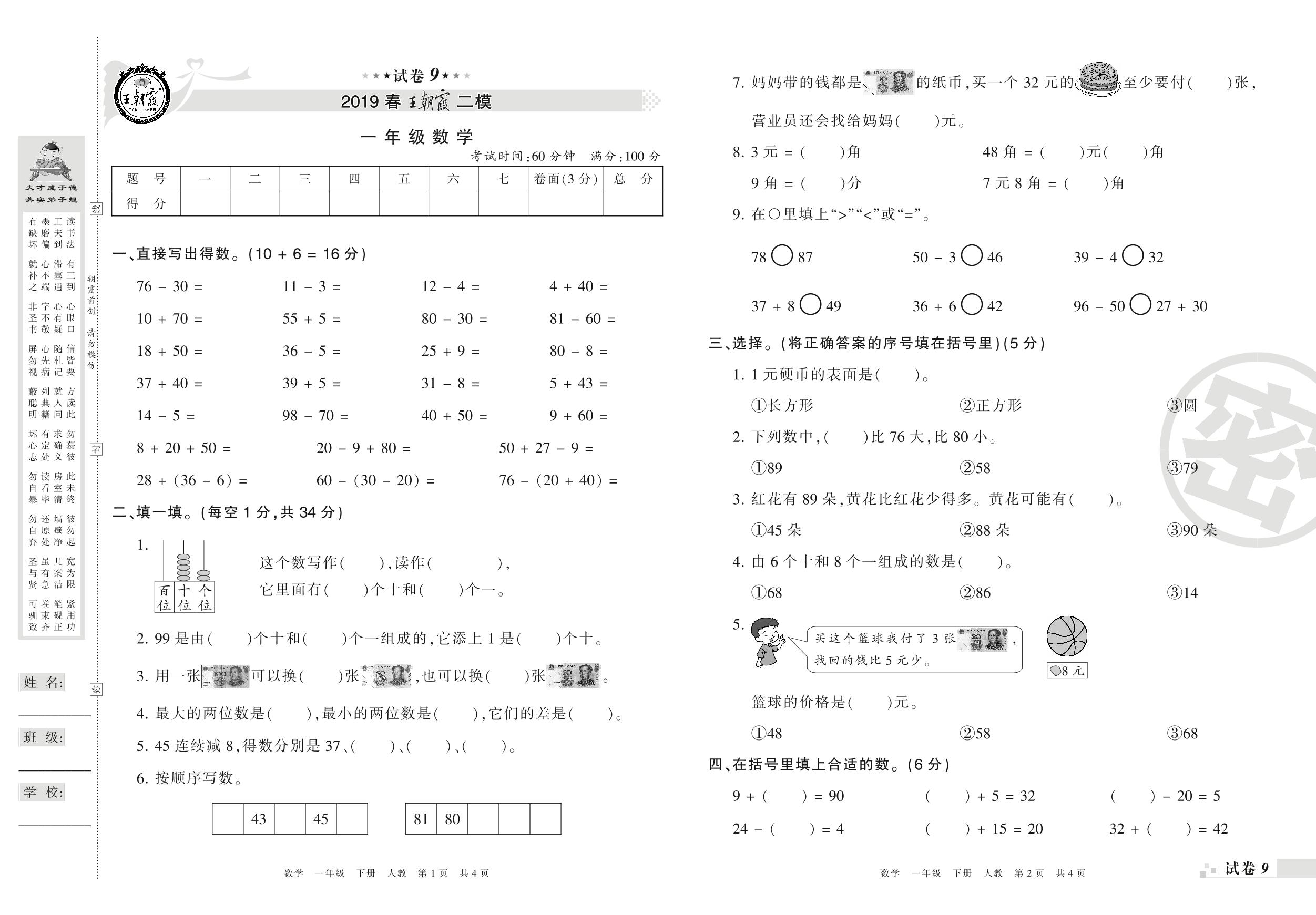 王朝霞期末模拟卷一年级下册数学(人教版)_R210802220619【9】