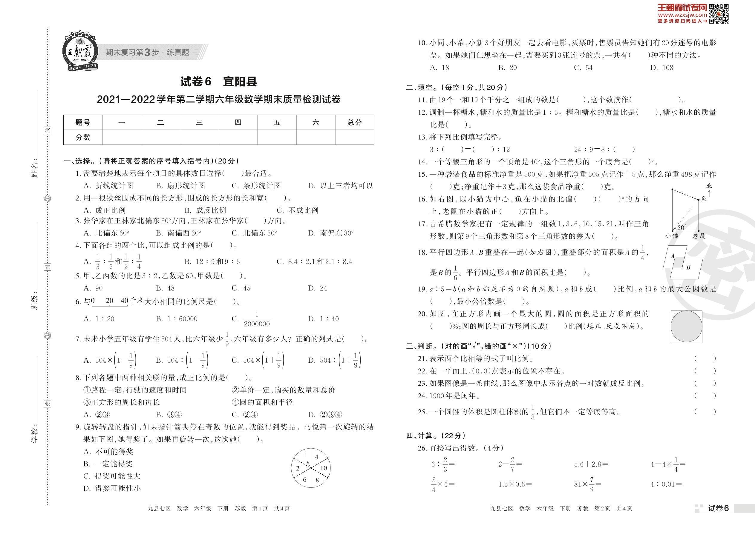 宜阳县2021—2022学年第二学期六年级数学期末质量检测试卷(苏教版)【6】