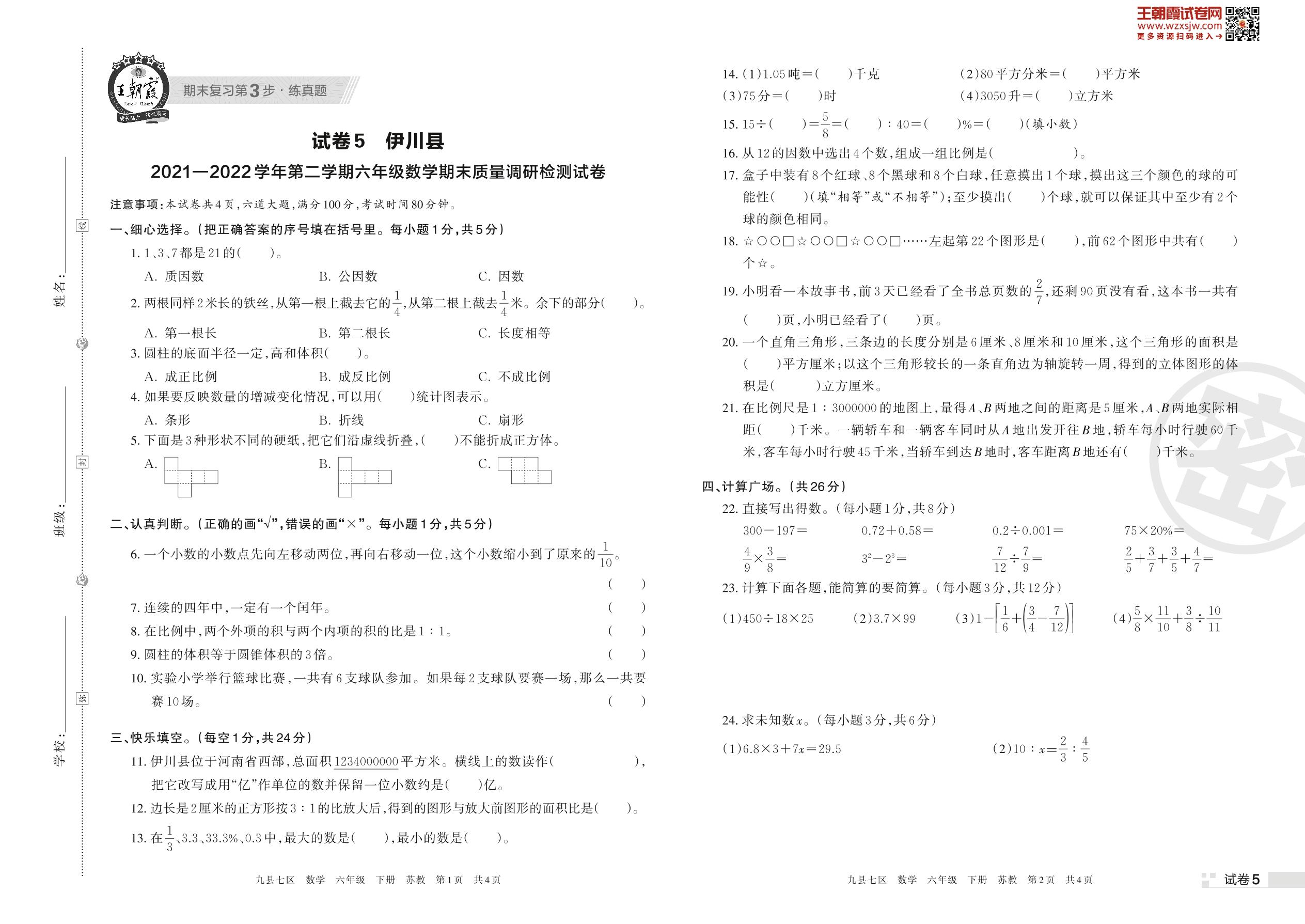 伊川县2021—2022学年第二学期六年级数学期末质量调研检测试卷(苏教版)【5】