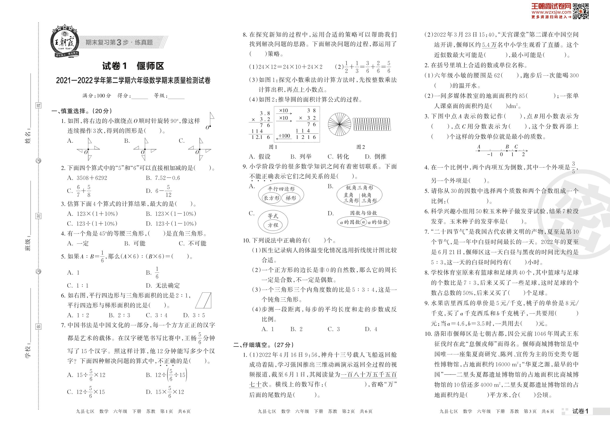 偃师区2021—2022学年第二学期六年级数学期末质量检测试卷(苏教版)【1】